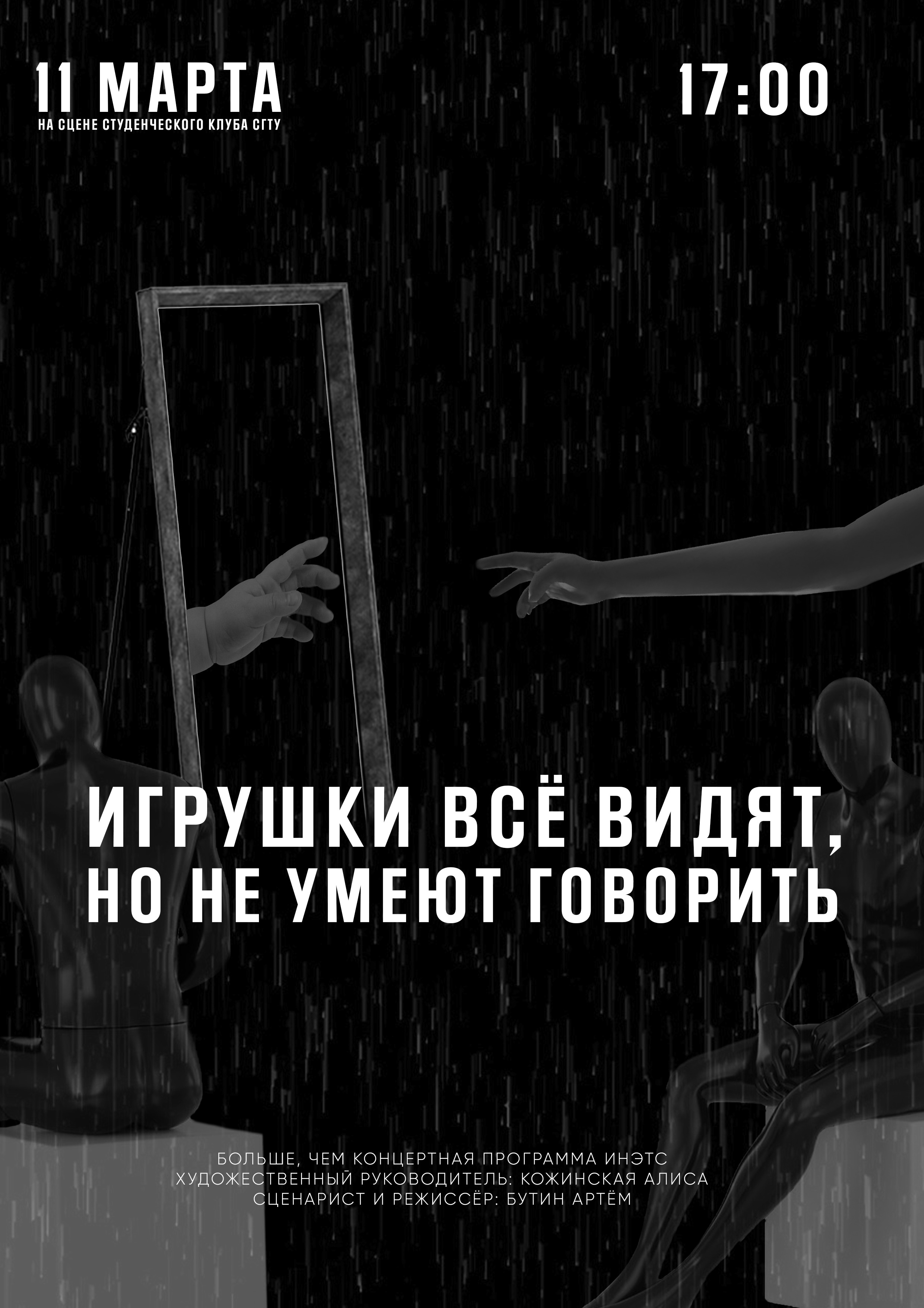 Название следующих выступающих «Игрушки всё видят, но не умеют говорить», заставляет задуматься, а что же покажут нам студенты, интрига продолжает сохраняться до вечера. Ребята обещают показать незабываемое шоу, с не менее загадочной развязкой.