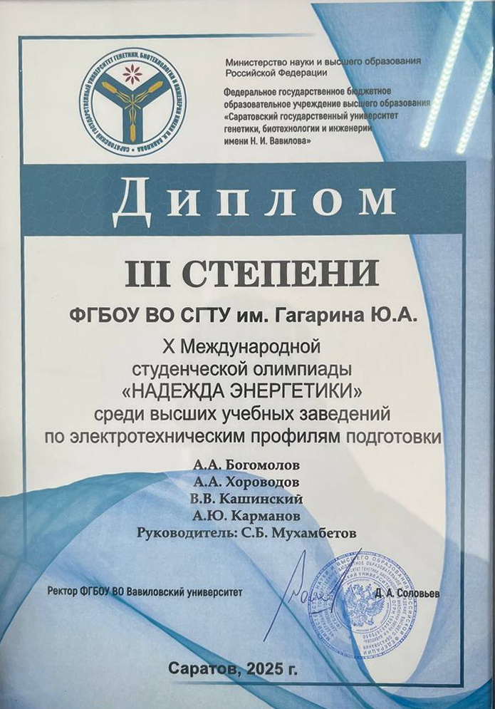 С 22 по 25 апреля 2025 года в Саратовском государственном университете генетики, биотехнологии и инженерии имени Вавилова Н.И. проходила X Международная студенческая олимпиада «Надежда энергетики» среди высших учебных заведений по электротехническим профилям подготовки. Мероприятие состоялось при поддержке ПАО «Россети Волга». В олимпиаде приняли участие 8 команд из разных вузов страны.