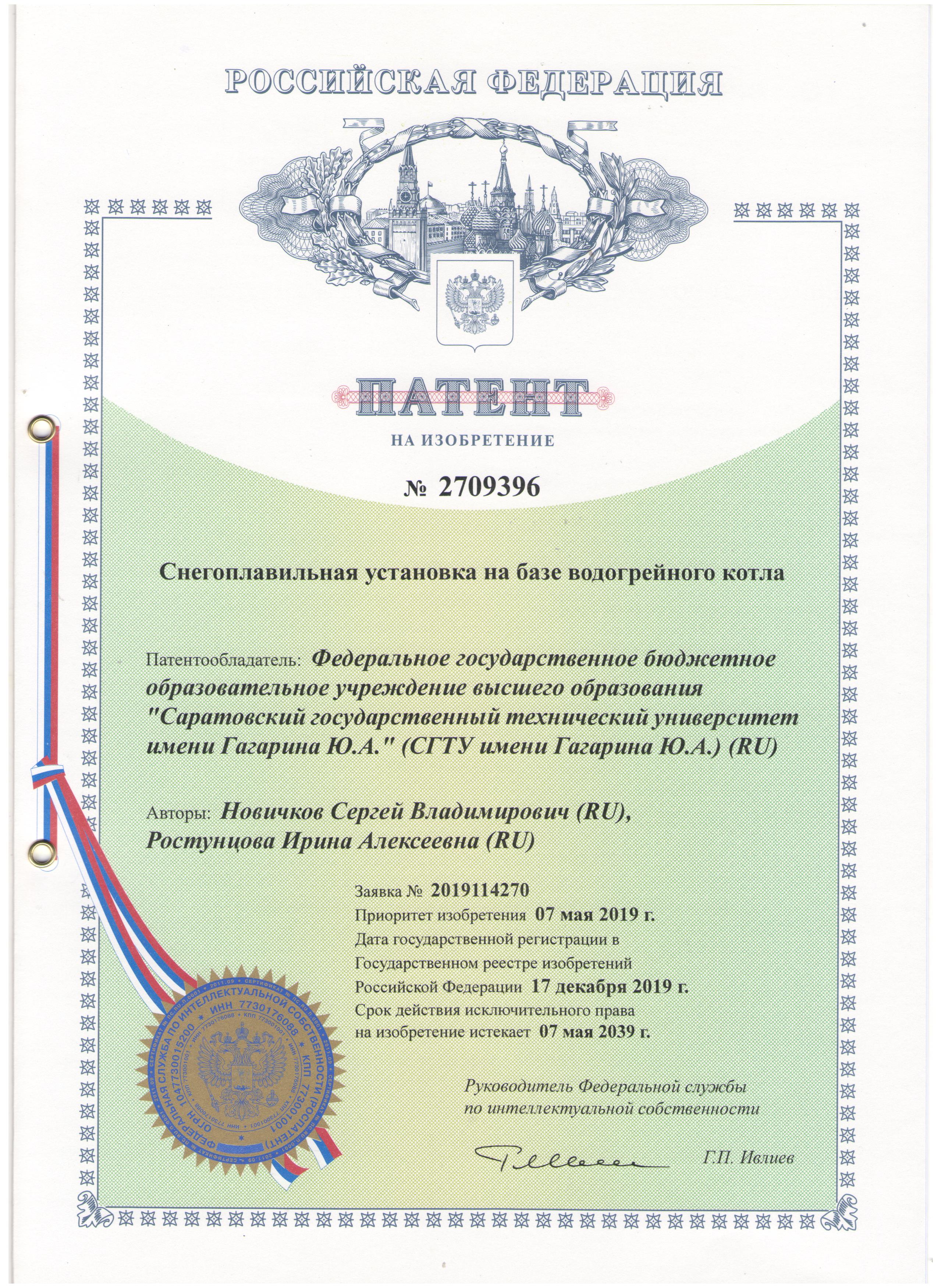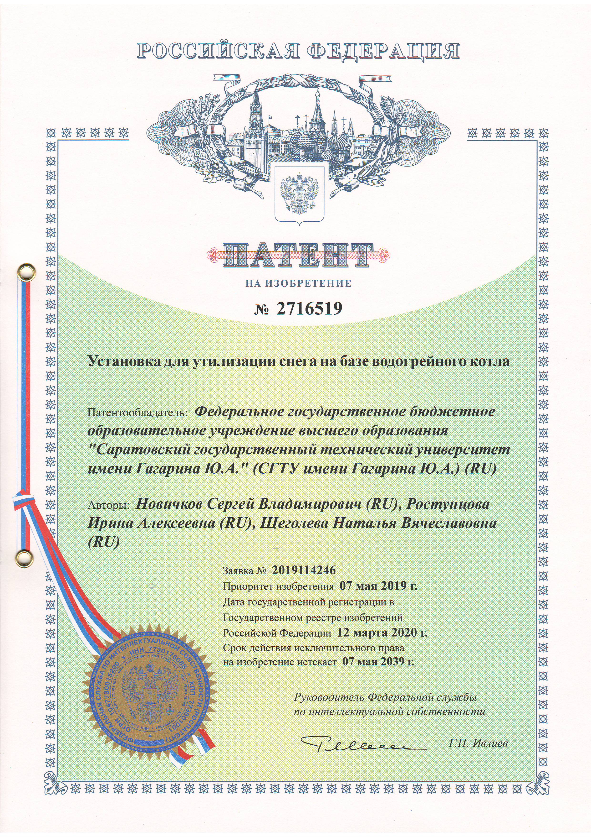 2) патент на ИЗ № 2716 519 «Установка для утилизации снега на базе водогрейного котла»;