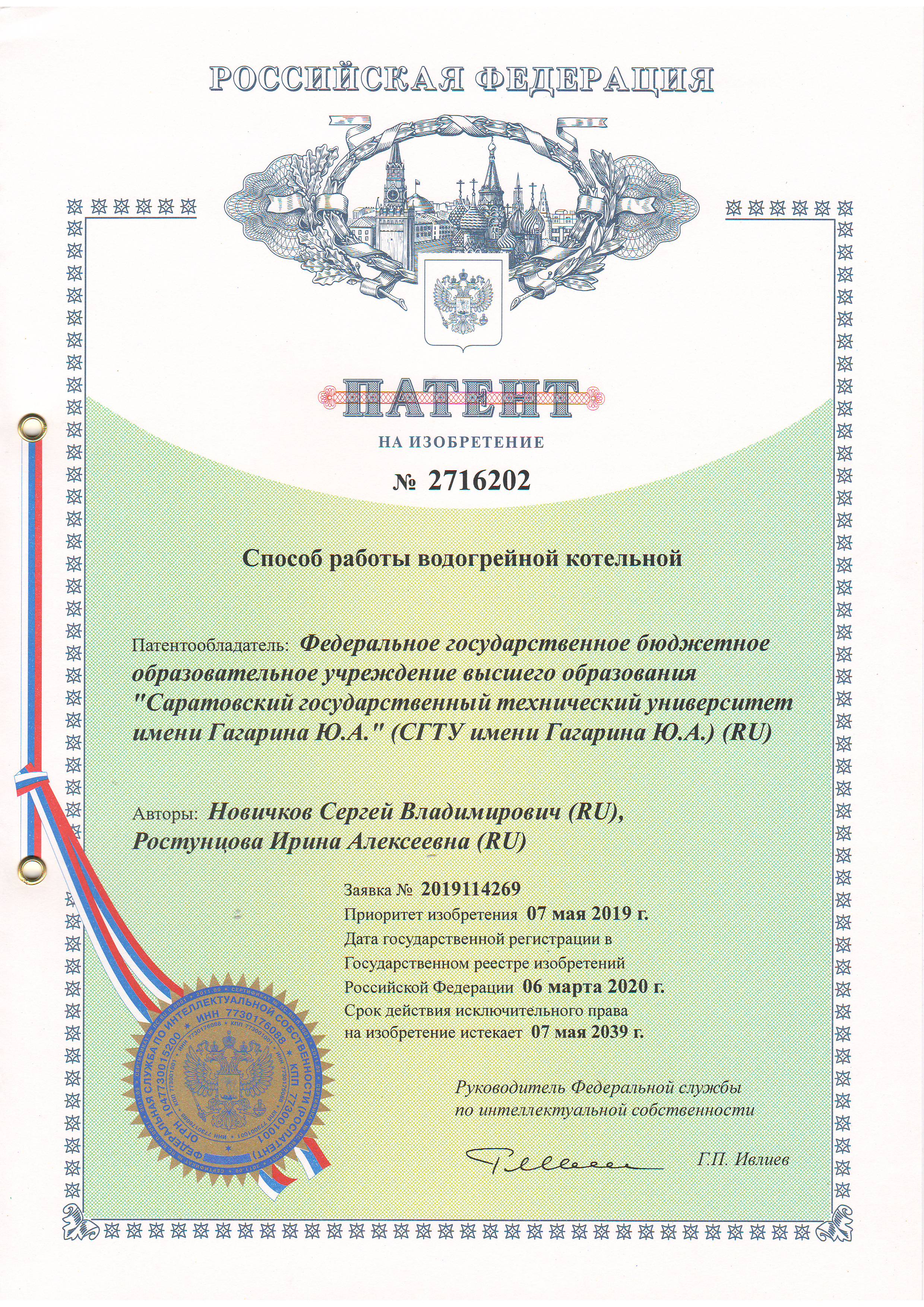 3) патент на ИЗ № 2716202 «Способ работы водогрейной котельной».