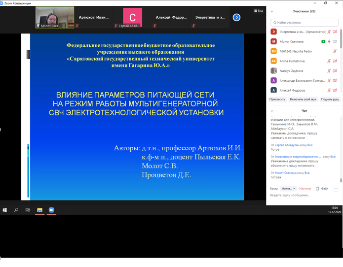 Они представили доклад на тему «Влияние параметров питающей сети на режим работы мультигенераторной СВЧ электротехнологической установки».
