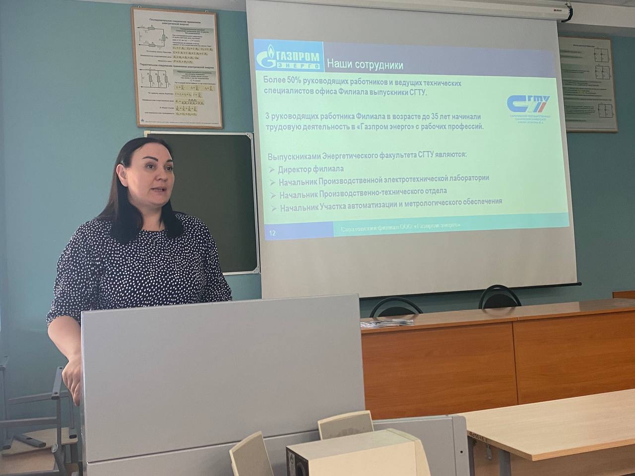 Цель мероприятия – развитие долгосрочного сотрудничества в рамках подготовки квалифицированных кадров для нужд энергетики, а также в подбор потенциальных кандидатов среди студентов для прохождения практики и дальнейшего трудоустройства. Сотрудники Саратовского филиала ООО «Газпром энерго» рассказали студенческой молодежи о направлениях деятельности ООО «Газпром энерго», возможностях трудоустройства, условиях работы, социальном обеспечении, перспективах карьерного роста и профессионального развития для молодых специалистов.