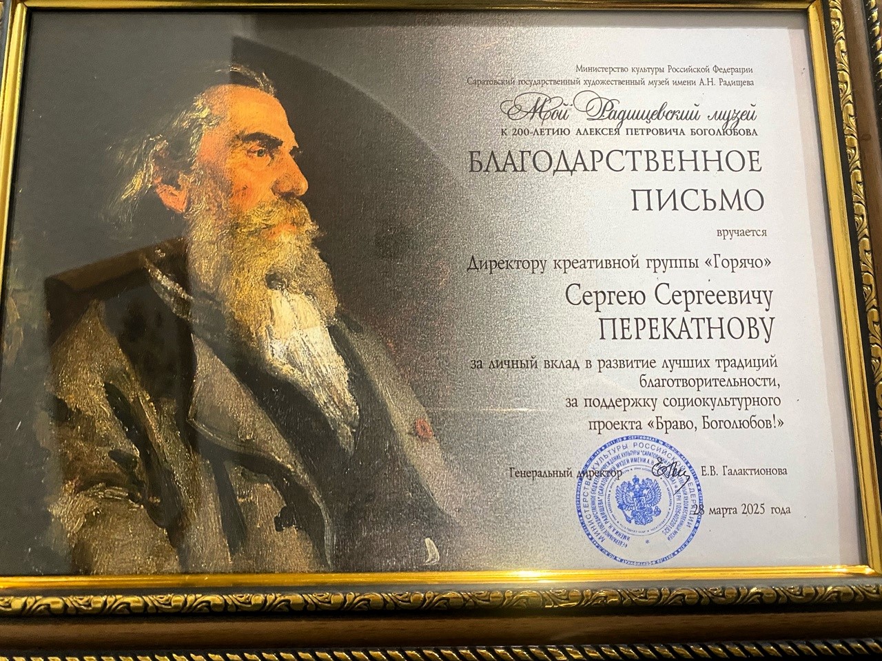 Сергей Сергеевич удостоился Благодарственного письма за личный вклад в развитие лучших традиций благотворительности и за поддержку социокультурного проекта «Браво, Боголюбов!».