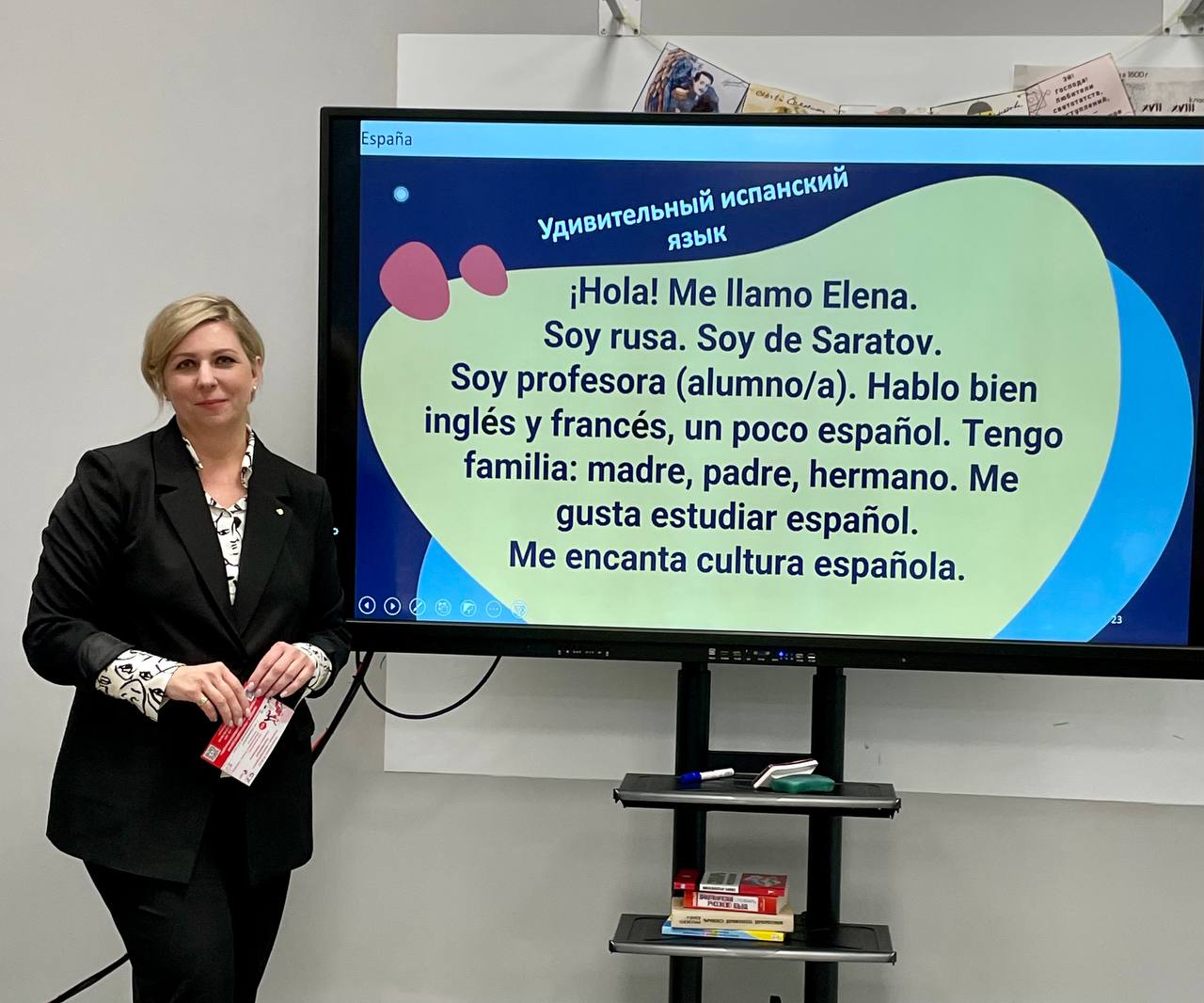 В рамках программы взаимодействия «Лицей-интернат 64 – СГТУ имени Гагарина Ю.А.: дорожная карта поддержки талантливой молодежи» заведующий кафедрой «Переводоведение и межкультурная коммуникация» Института прикладных информационных технологий и коммуникаций Елена Овчинникова провела мастер-класс «Испанский за 40 минут» для обучающихся лицея.
