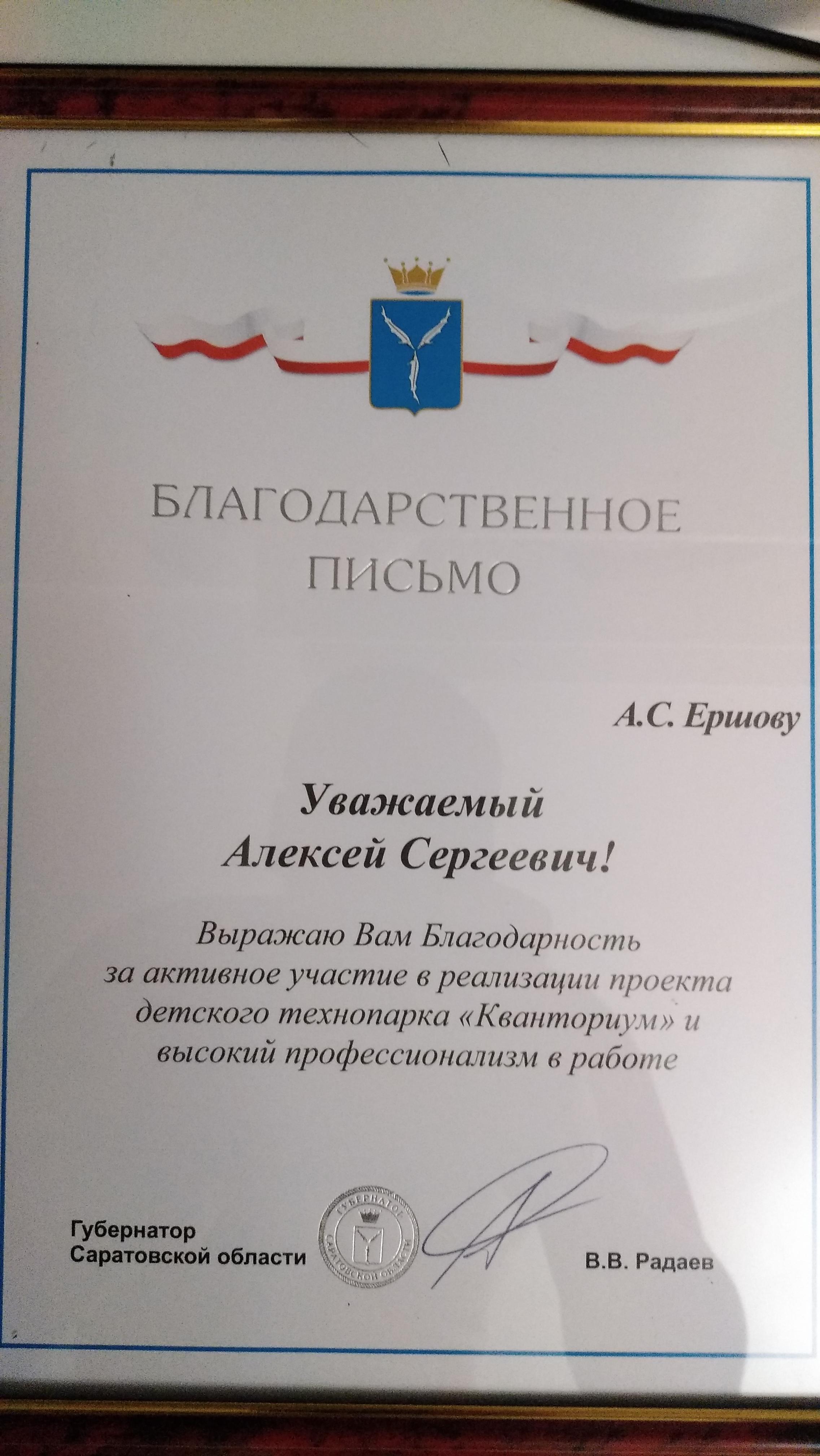 В тексте благодарственного письма отмечено, что Алексей Ершов проявил активное участие в реализации проекта детского технопарка «Кванториум».