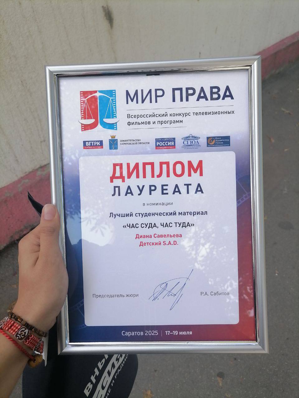Финал конкурса телевизионных фильмов и программ «Мир права» прошел в конце июля на площадке Саратовской государственной юридической академии и собрал участников со всей страны. Среди традиционных номинаций «Лучший информационный сюжет», «Лучший документальный фильм», «Лучшее журналистское расследование» и прочих появились и новые – «Лучшая работа телеведущего», «Право на память» и «Право на правду», в которых оценивались журналистские материалы, посвященные героям Великой Отечественной войны и специальной военной операции, а также «Право на мечту», где представлены видеоматериалы, рассказывающие о надежде и любви, о поступках во благо общества и страны. Участники и гости приняли участие в насыщенной культурно-познавательной программе. Соучредителями конкурса выступили ГТРК «Саратов», СГЮА, Саратовское региональное отделение Союза журналистов России под патронатом ВГТРК и при поддержке Правительства Саратовской области.