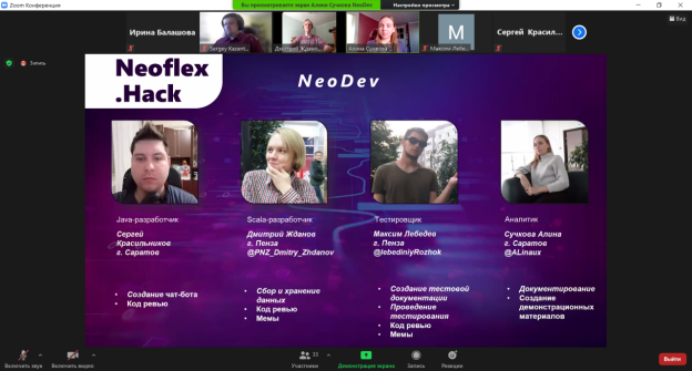 Соревнование Neoflex.Hack проводила компания «Неофлекс» с 1 по 3 марта. Студенты ведущих вузов Саратова, Воронежа и Пензы создавали telergam-бот, который умеет здороваться и по команде предоставлять стоимость запрошенной криптовалюты. Команды, состоящие из java- и scala-разработчика, тестировщика и аналитика, решали задачу на нескольких уровнях сложности. Менторскую поддержку участникам обеспечивали эксперты «Неофлекс», которые выступили и в роли жюри.