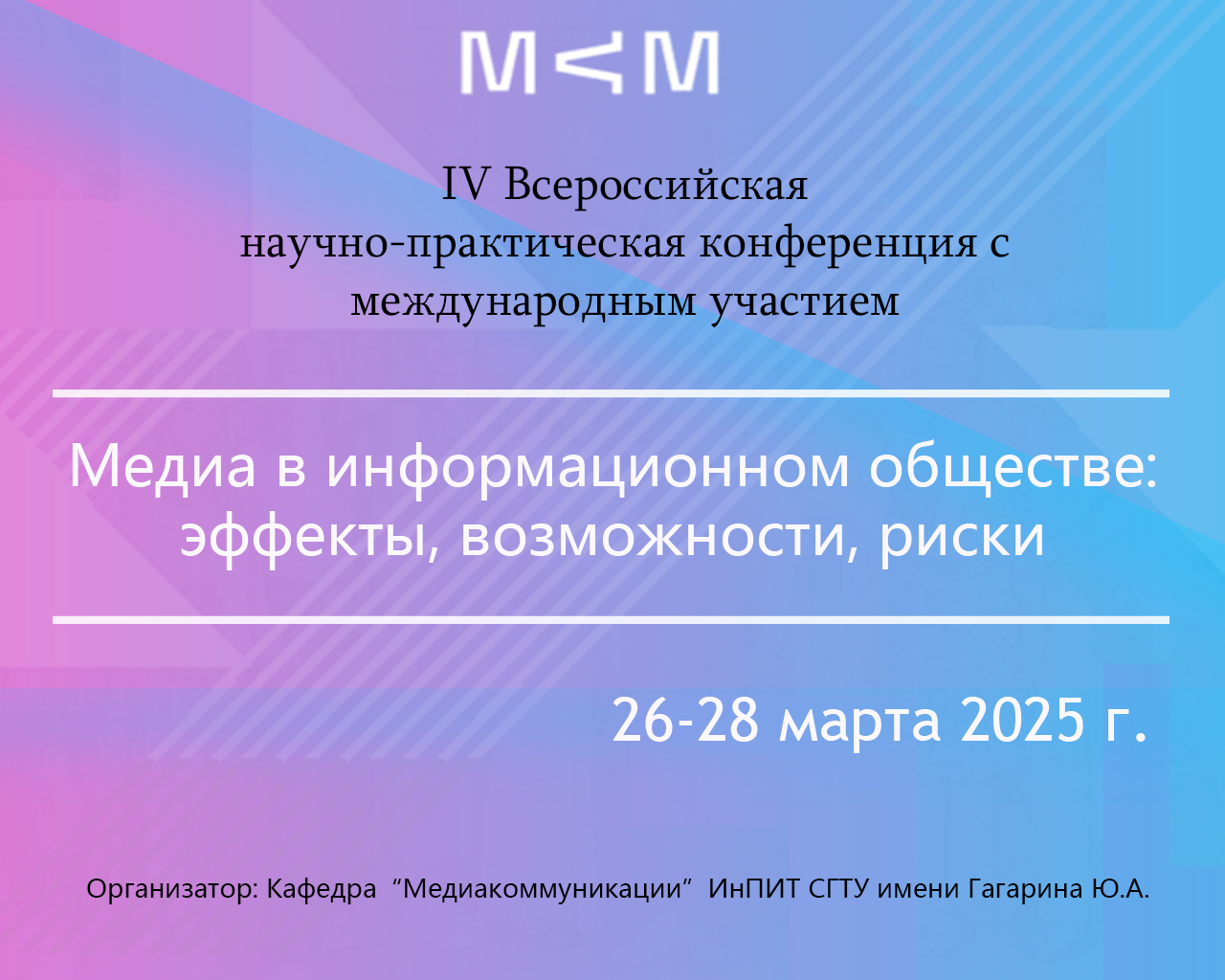 26 – 28 марта в Институте прикладных информационных технологий и коммуникаций СГТУ имени Гагарина Ю.А. состоится IV Всероссийская научно-практическая конференция с международным участием «Медиа в информационном обществе: эффекты, возможности, риски». Организатор – кафедра «Медиакоммуникации».