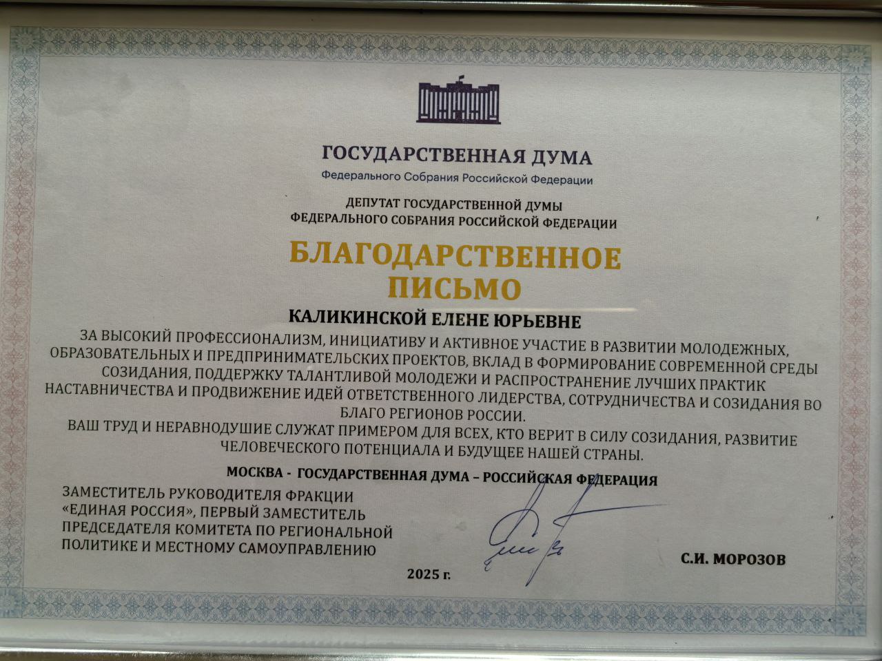 За высокий профессионализм, инициативу и активное участие в развитии молодежных, образовательных и предпринимательских проектов, вклад в формирование современной среды созидания, поддержку талантливой молодежи, распространение лучших практик наставничества и продвижение идей ответственного лидерства, сотрудничества и созидания во благо регионов России Елена Каликинская была отмечена Благодарственным письмом за подписью депутата Государственной Думы Федерального собрания Российской Федерации, заместителя руководителя фракции Единая Россия, координатора партийного проекта «Выбирай своё», первого заместителя председателя Комитета Государственной Думы по региональной политике и местному самоуправлению Сергея Морозова.