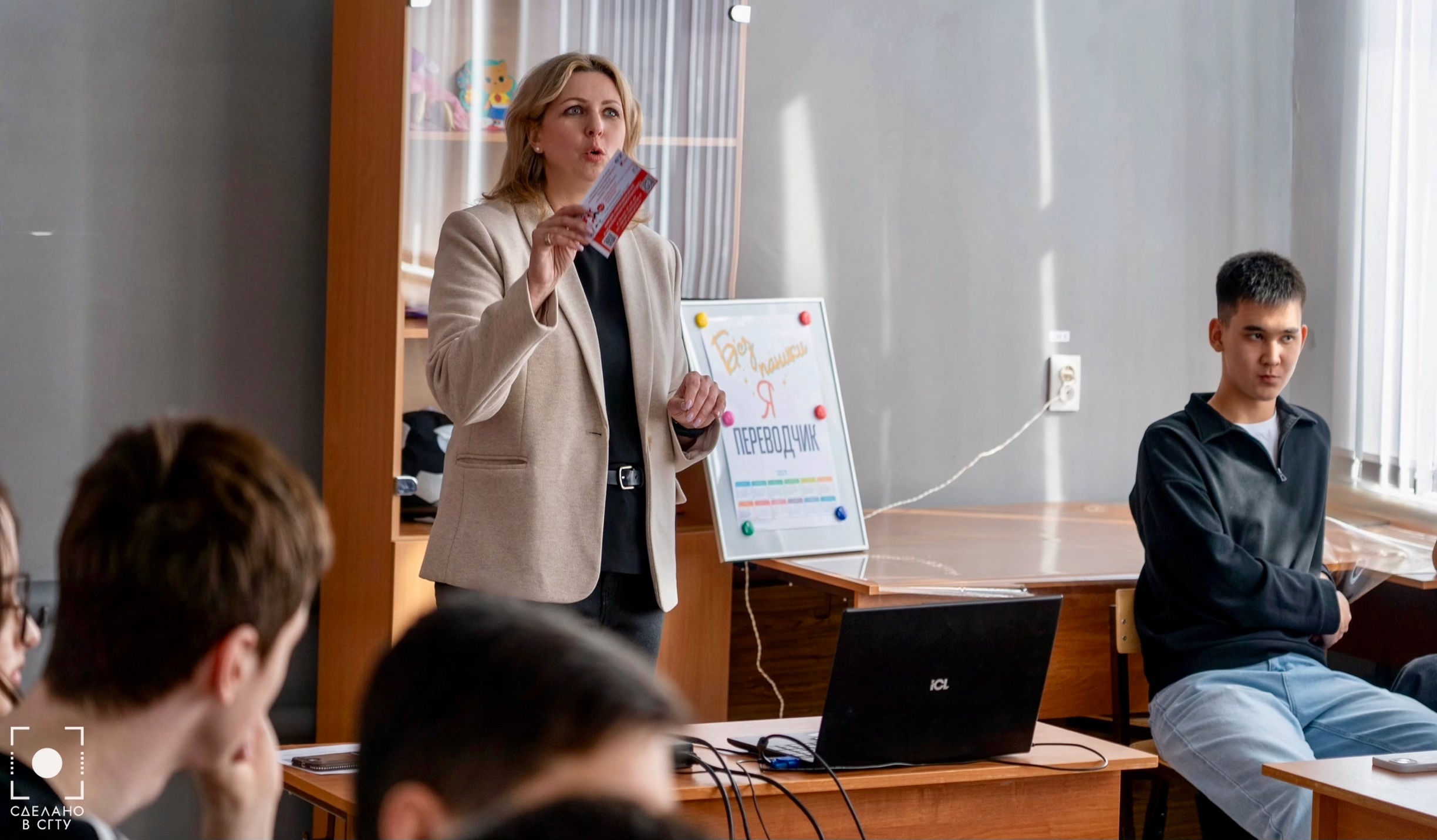 Заведующая кафедрой "Переводоведение и межкультурная коммуникация" Елена Овчинникова провела для школьников МБОУ СОШ №1 с. Александров Гай мастер-класс "Примерочная профессий".
