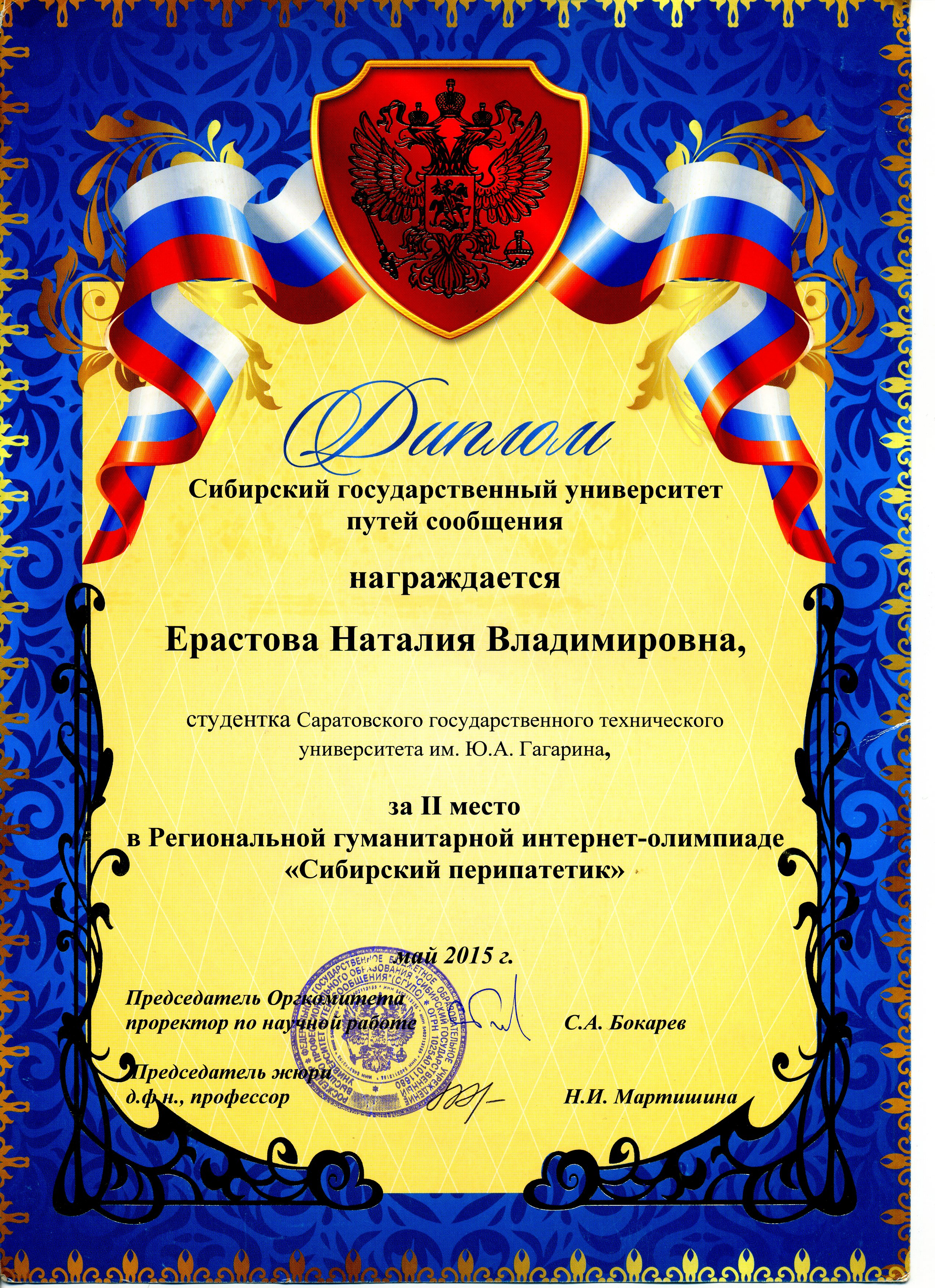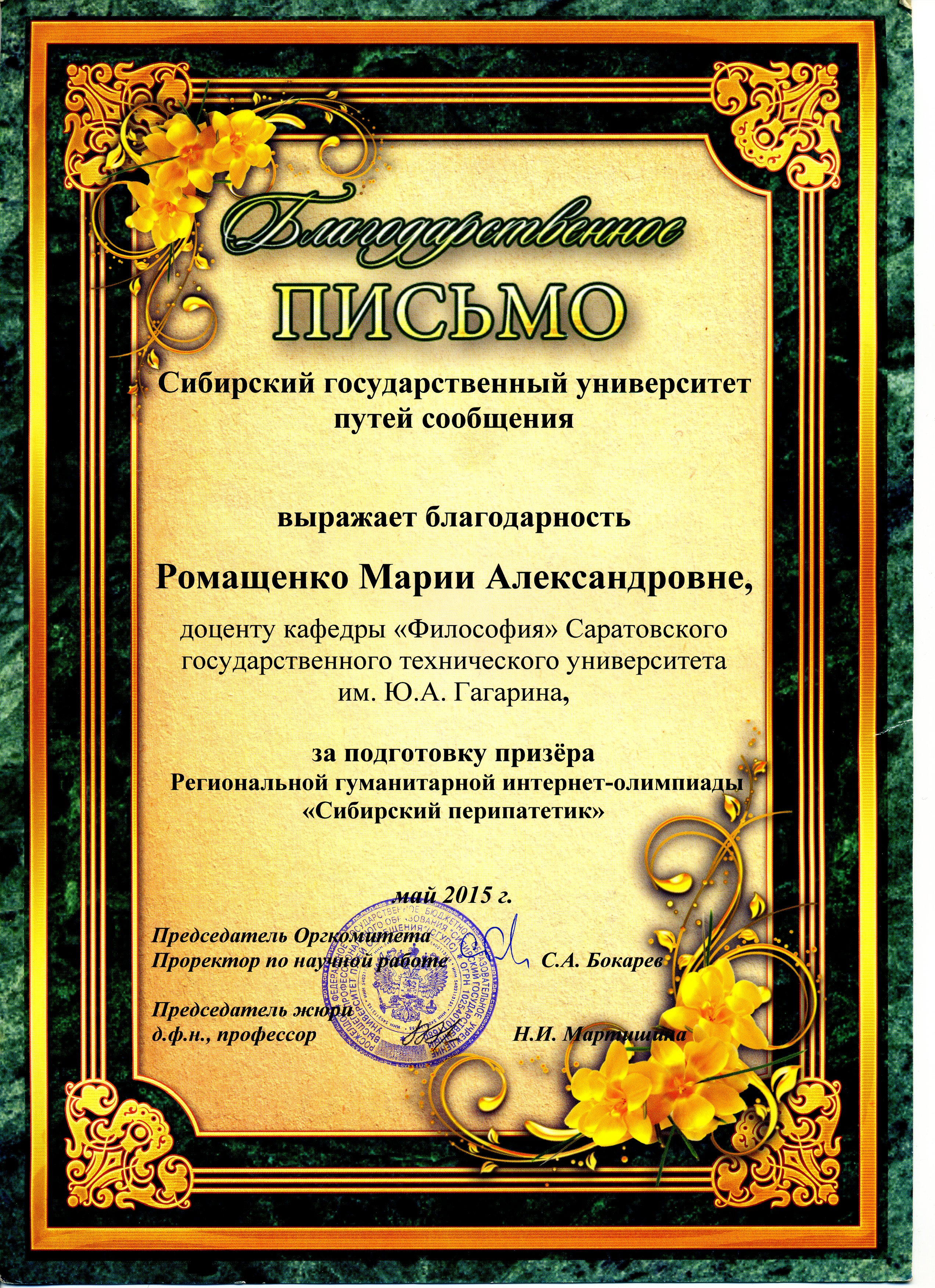 Студентка Социально-гуманитарного факультета СГТУ имени Гагарина Ю.А. направления ПСХЛ заочного обучения Ерастова Н.В. под руководством доцента кафедры философии М.А. Ромащенко стала призером Региональной гуманитарной интернет-олимпиады «Сибирский перипатетик» в городе Новосибирск, завоевав второе место. Доцент М.А. Ромащенко получила благодарственное письмо из Сибирского государственного университета путей сообщения, в котором проходила интернет-олимпиада.