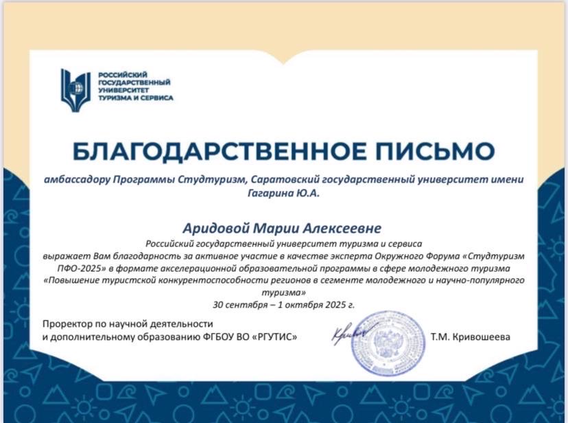 В Нижнем Новгороде успешно прошел шестой окружной форум «Студтуризм-2025», объединивший представителей 22 университетов из 13 регионов России. Масштабное событие, проходящее при поддержке Минобрнауки России и Правительства Нижегородской области, стало ключевой площадкой для синтеза образования, науки и туризма. В числе участников форума – студентка 3 курса бакалавриата направления «Туризм» Социально-экономического института СГТУ имени Гагарина Ю.А.Мария Аридова, чья работа была отмечена благодарственным письмом.