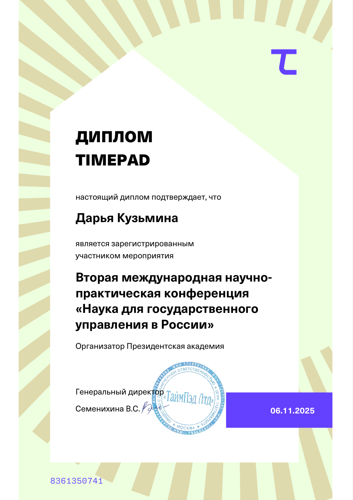 Мероприятие проходило в Российской академии народного хозяйства и государственной службы при Президенте РФ. Дарья Кузьмина представила доклад на тему «Повышение эффективности документационного обеспечения управленческих процессов в условиях информационного общества за счет использования новых междисциплинарных подходов». Научная работа выполнена под руководством доцента кафедры «Политология и социология» Андрея Левченко.