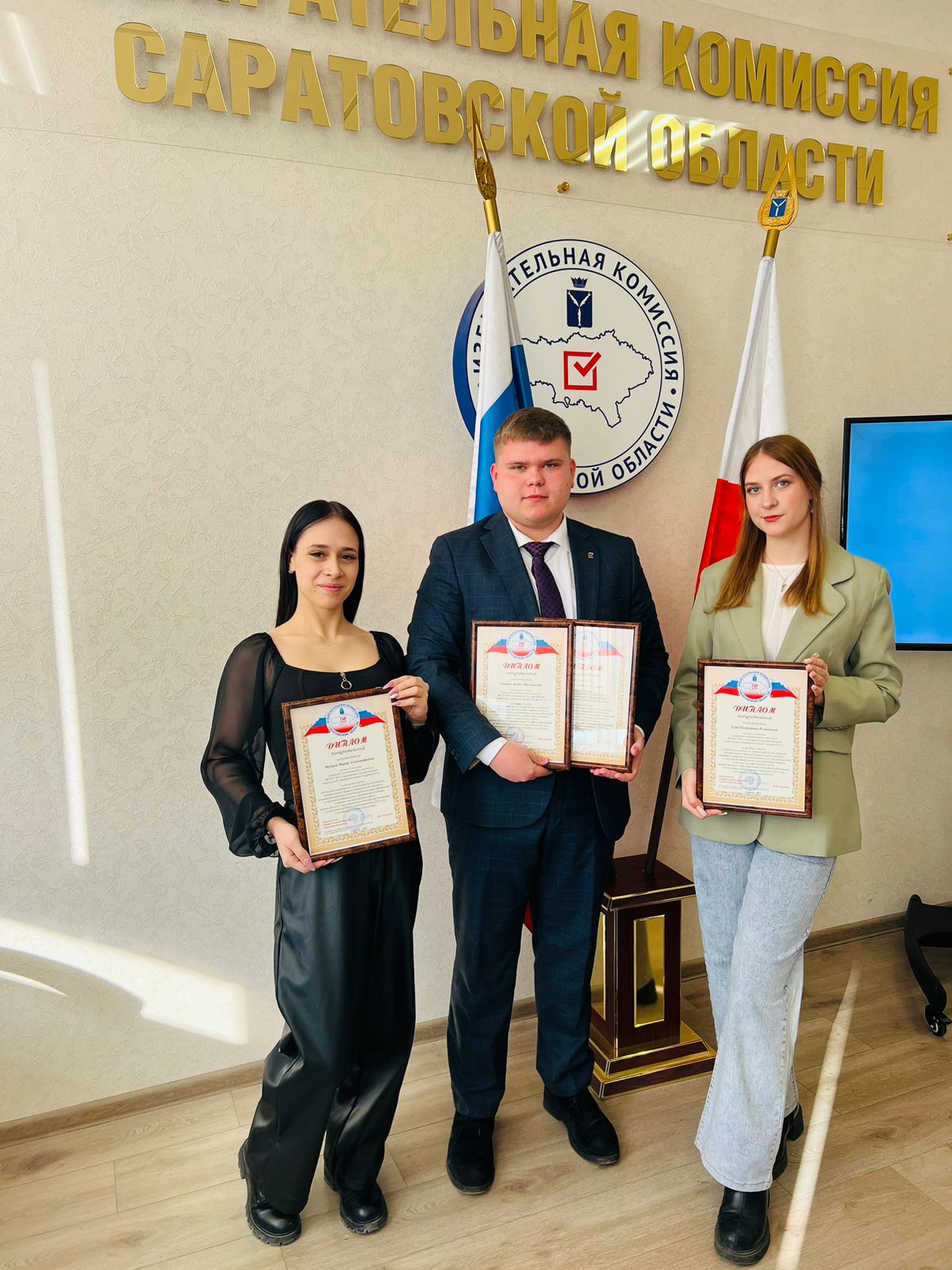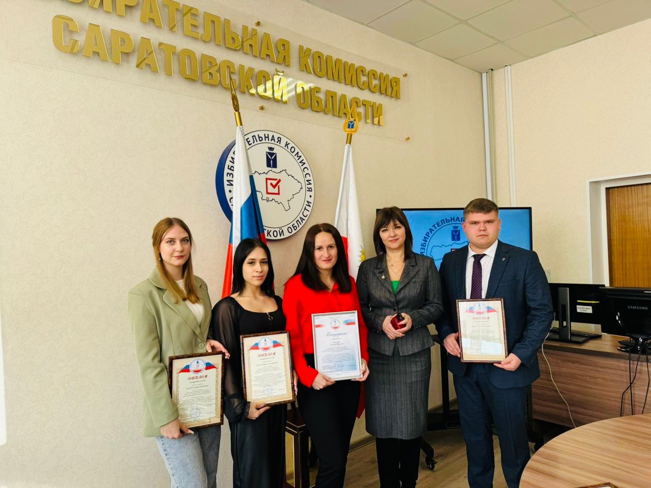 В Избирательной комиссии Саратовской области состоялось награждение студентов, ставших победителями в областном конкурсе на лучшую работу по вопросам избирательного права и избирательного процесса, повышения правовой и политической культуры участников референдума, организаторов выборов в органы государственной власти, органы местного самоуправления в Российской Федерации и участников избирательных кампаний в 2024 году.