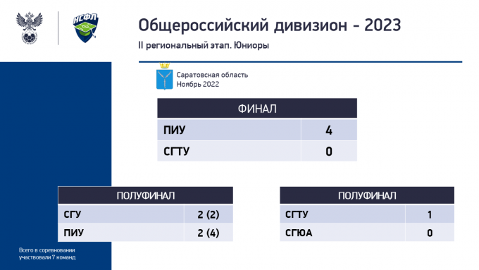 «В первую очередь, конечно, сказалось, что наша команда проводила к тому моменту не первую встречу, тогда как команда ПИУ только начала своё выступление, а так же, думаю, так как команда СГТУ не являлась фаворитом в этом матче, настрой на игру был разный. Мы были настроены, соперник, наоборот, недооценил нас. Финал показал обратное. К тому же меня не было на финальной игре – пришлось уехать на другие соревнования по мини-футболу. Настроить команду на расстоянии не получилось должным образом».