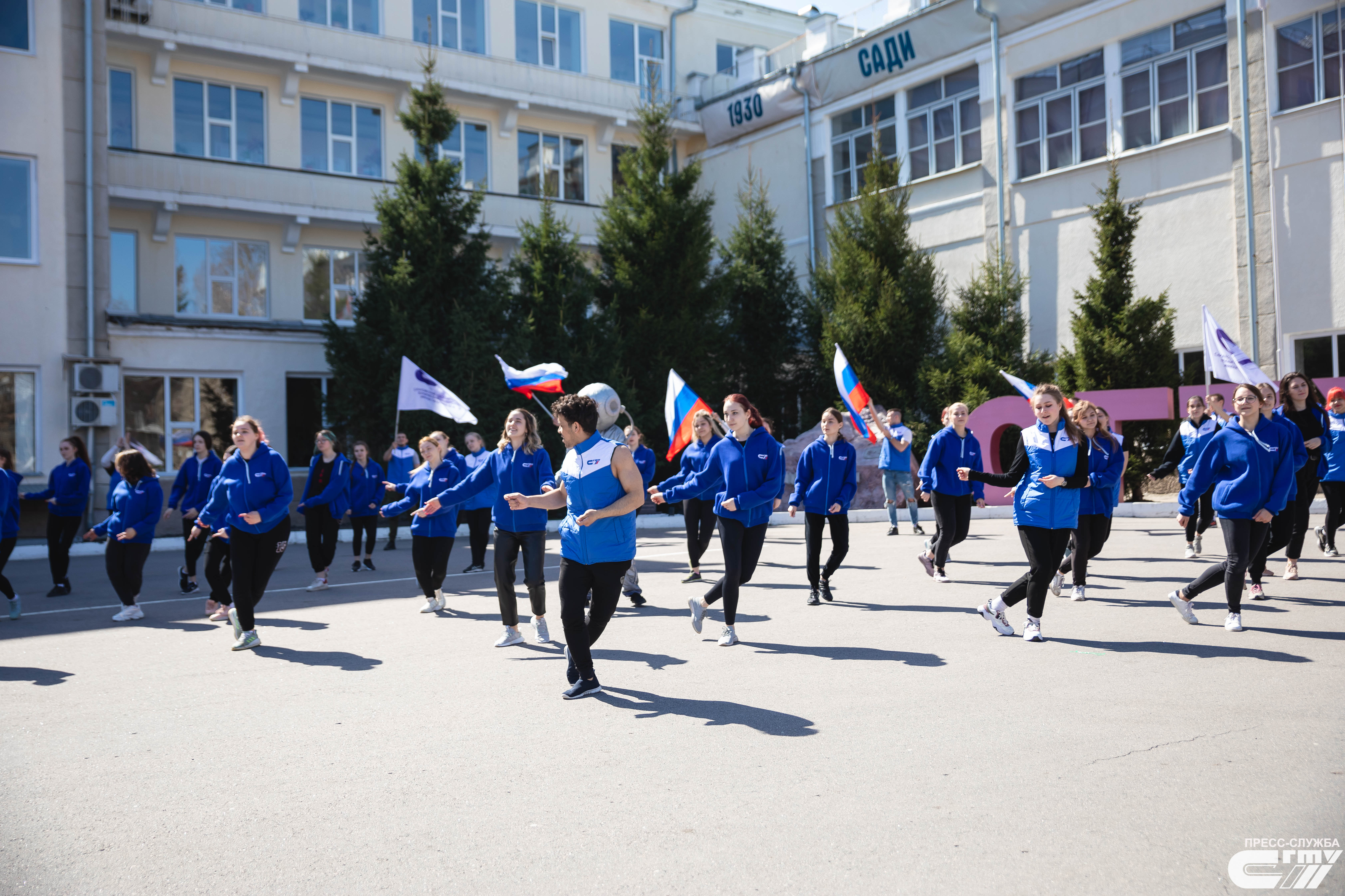 В выступлении приняли участие студенты СЭИ под руководством Ирины Милехиной, а так же студенты основной, специально-медицинской группы и группы элективной дисциплины «Черлидинг» под руководством Влады Пилюшкиной и Татьяны Кошелевой.
