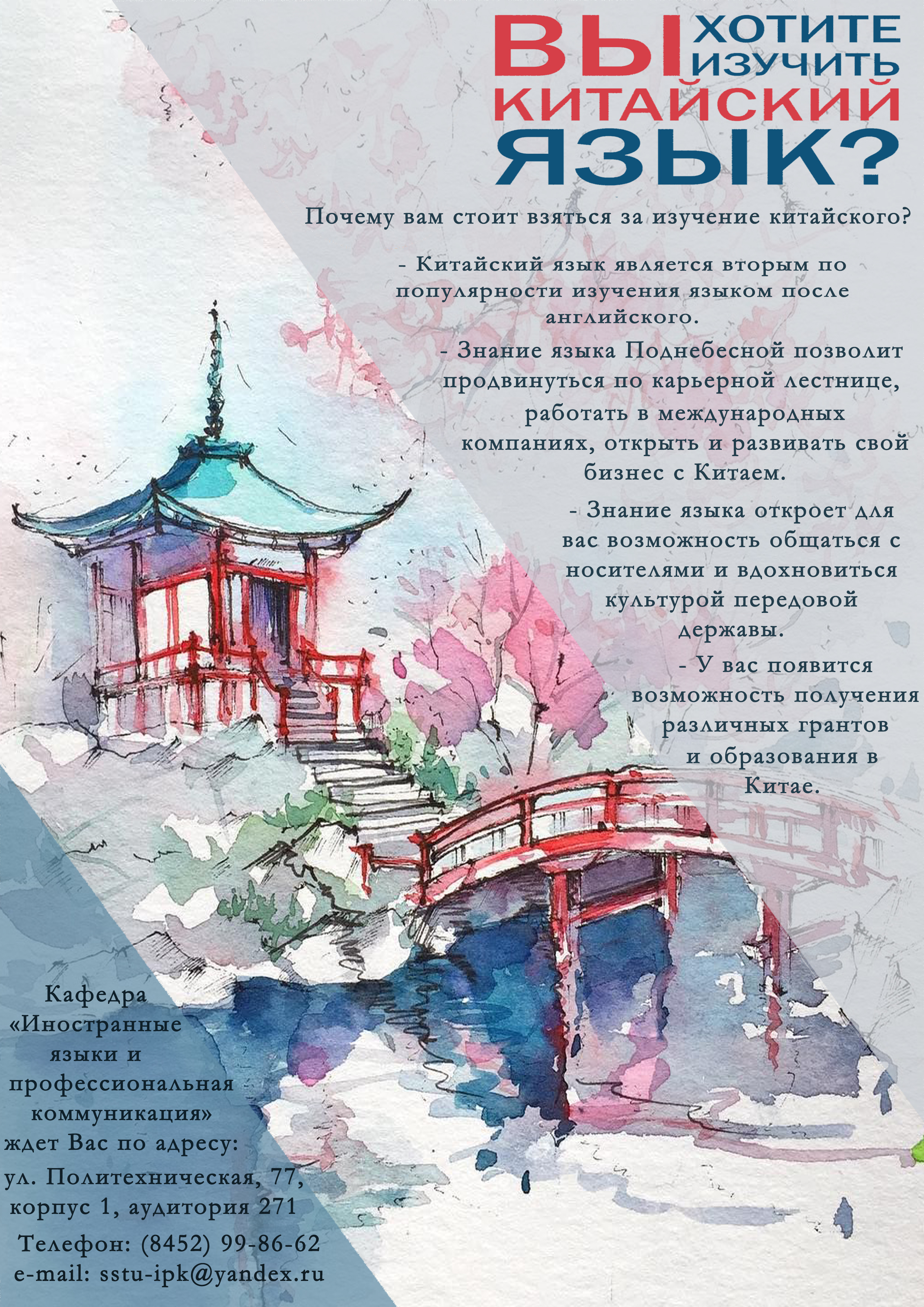 Кафедра «Иностранные языки и профессиональная коммуникация» Института социального и производственного менеджмента СГТУ имени Гагарина Ю. А. приглашает преподавателей и студентов на курсы изучения китайского языка.