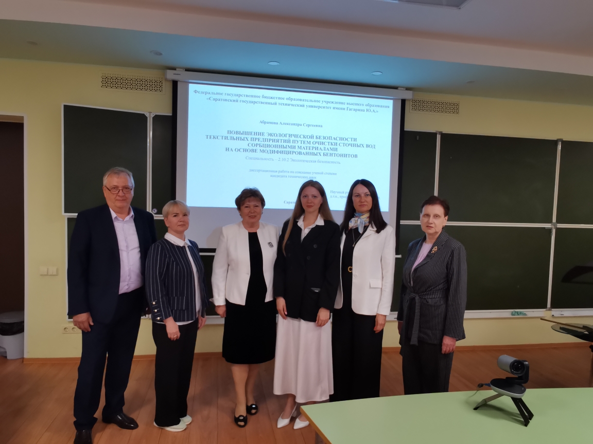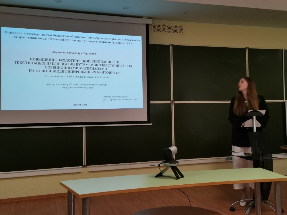 На заседании диссертационного совета Санкт-Петербургского политехнического университета Петра Великого состоялась защита диссертации Александры Абрамовой (Глубокой) на тему «Повышение экологической безопасности текстильных предприятий путем очистки сточных вод сорбционными материалами на основе модифицированных бетонитов» на соискание ученой степени кандидата технических наук по научной специальности «Экологическая безопасность».