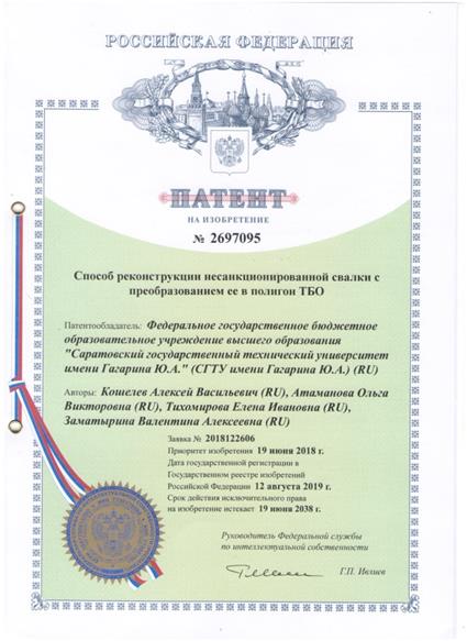 – Патент РФ на изобретение № 2697095 МПК В09В 1/00. Способ реконструкции несанкционированной свалки с преобразованием ее в полигон ТБО. Опубликовано в БИ РФ № 23, 2019 г.; заявка № 2018122606 от 19.06.2018. Авторский коллектив: Кошелев А.В., Атаманова О.В., Тихомирова Е.И., Заматырина В.А.
