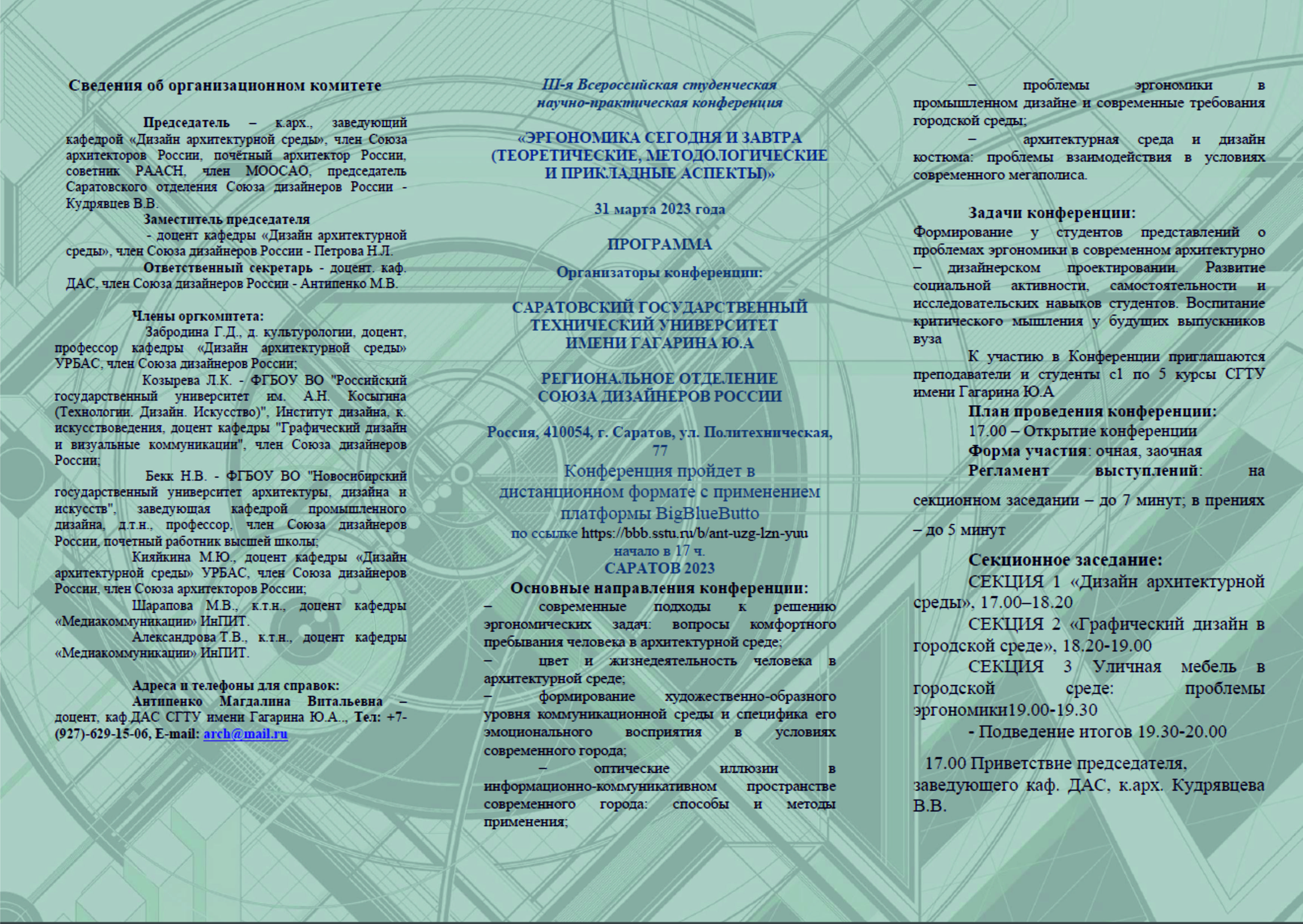 На кафедре «Дизайн архитектурной среды» Института урбанистики, архитектуры и строительства СГТУ имени Гагарина Ю.А. при поддержке регионального отделения Союза дизайнеров России состоялась ежегодная III Всероссийская студенческая научно-практическая конференция «Эргономика сегодня и завтра (теоретические, методологические и прикладные аспекты)».