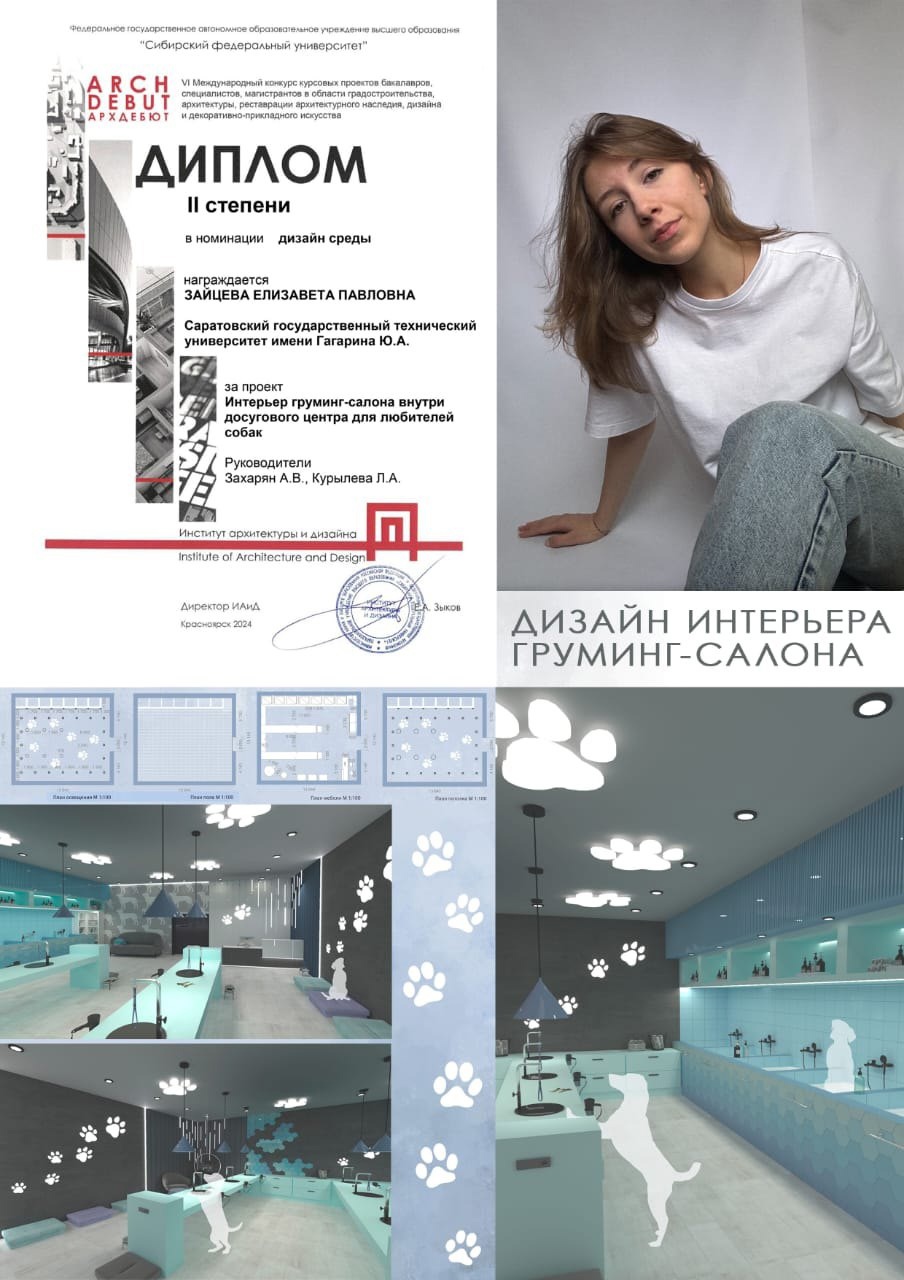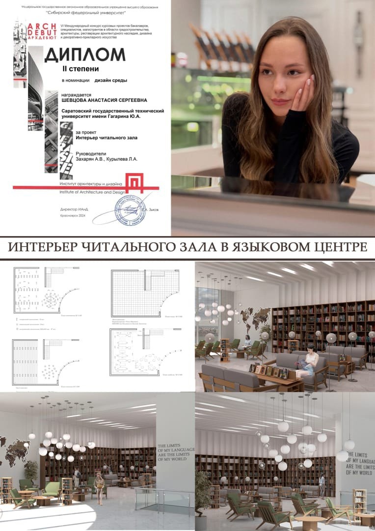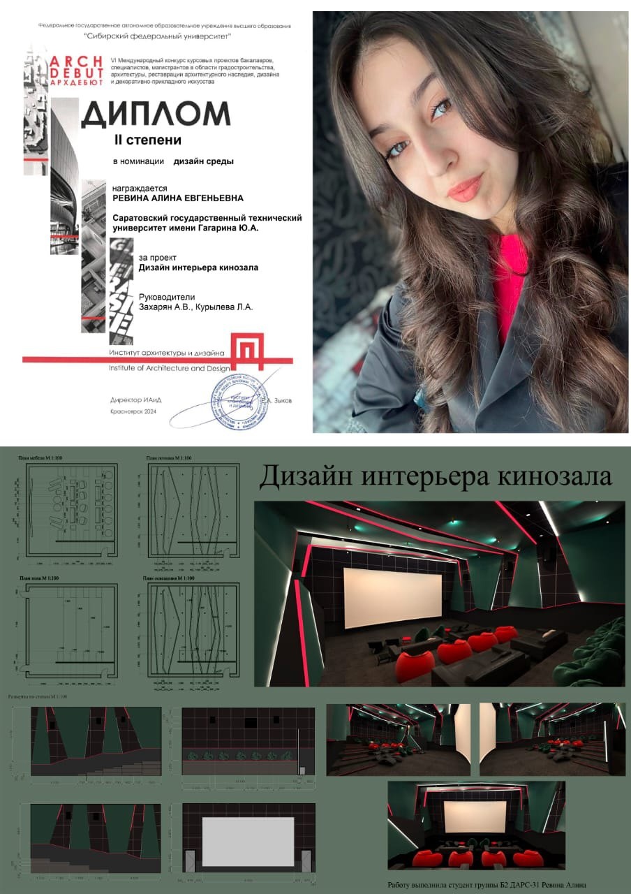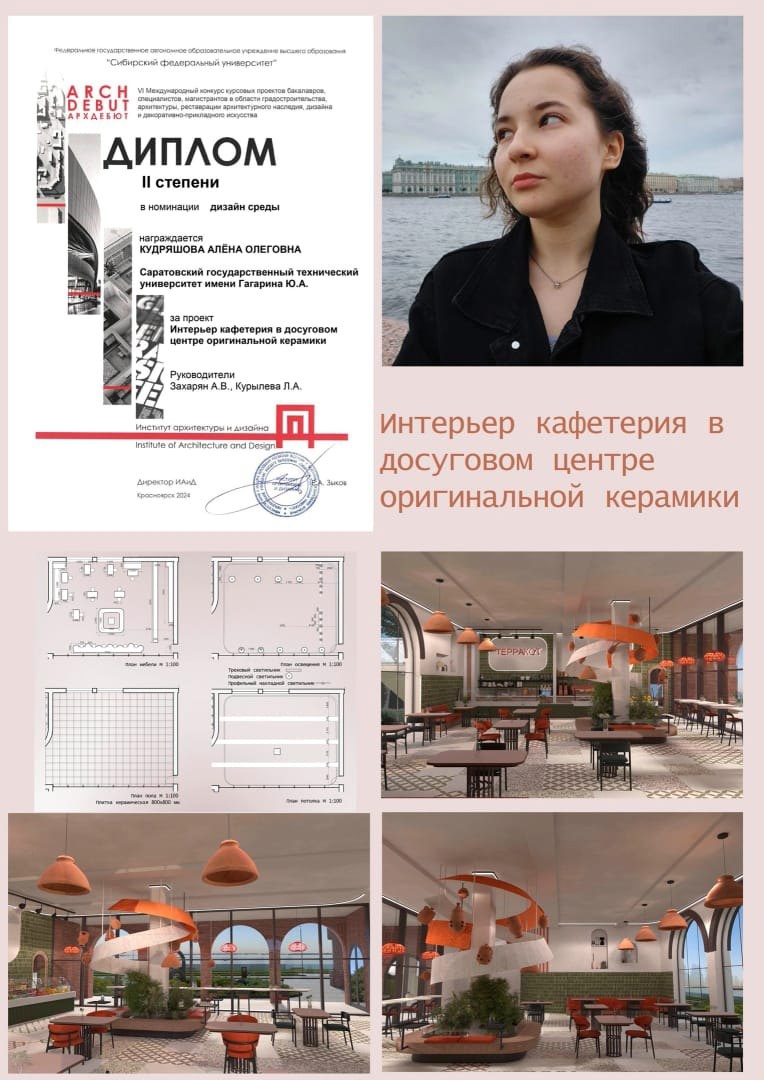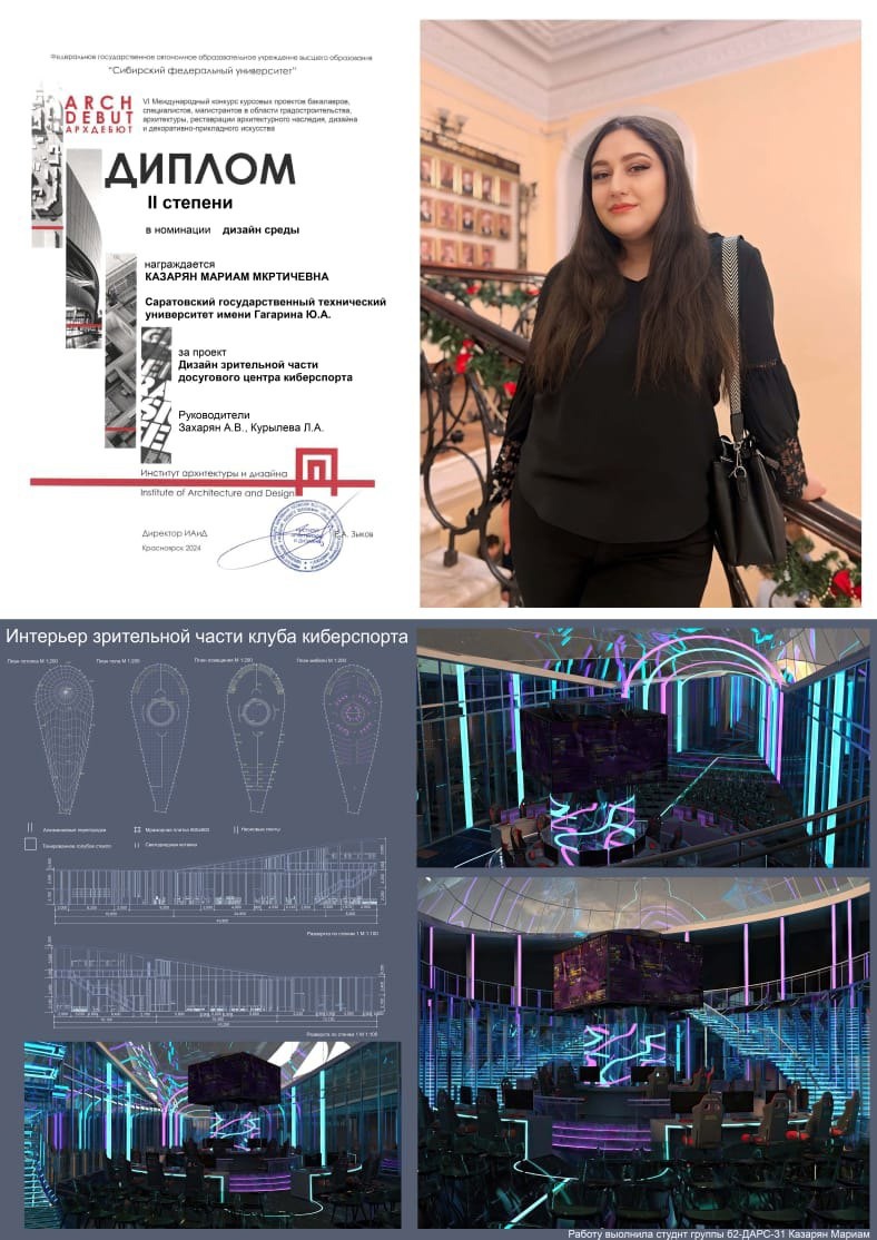 Студентка Мариам Казарян представила проект «Дизайн зрительной части досугового центра киберспорта», Елизавета Зайцева – проект «Интерьер груминг-салона внутри досугового центра для любителей собак», Алена Кудряшова – проект «Интерьер кафетерия в досуговом центре оригинальной керамики», Анастасия Шевцова – проект «Интерьер читального зала в языковом центре», Таисия Вербина – проект «Интерьер кафетерия в центре медитации», Алина Ревина – проект «Дизайн интерьера кинозала», Дарья Сухова – проект «Интерьер кафетерия медиацентра».