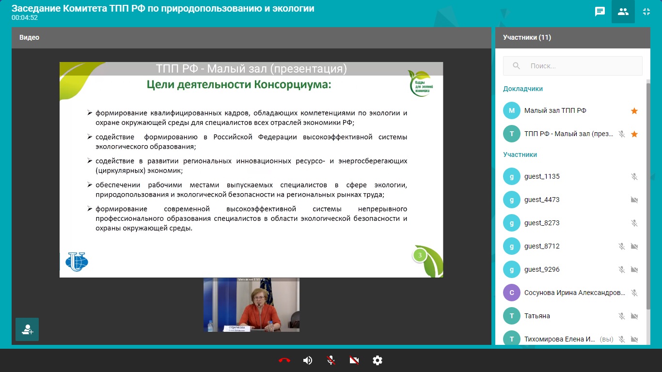 Основная цель заседания заключалась в рассмотрении механизмов взаимодействия заинтересованных сторон в развитии системы экологического практико-ориентированного образования нового типа на базе цифровых платформ. Елена Тихомирова рассказала об опыте выполнения проектно-ориентированных работ на кафедре «Экология», о совместных студенческих проектах с кафедрой «Строительные материалы и технологии».