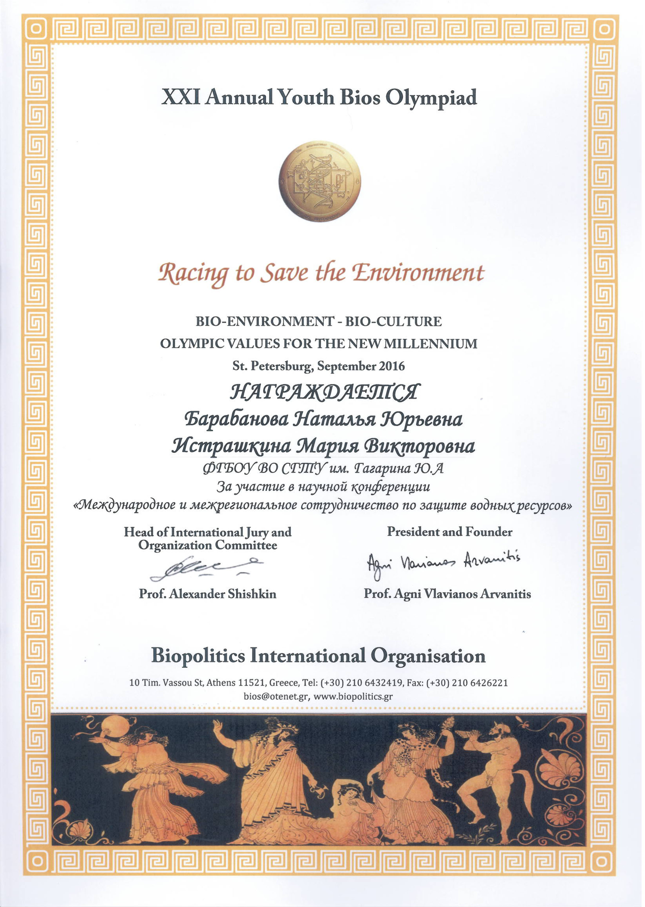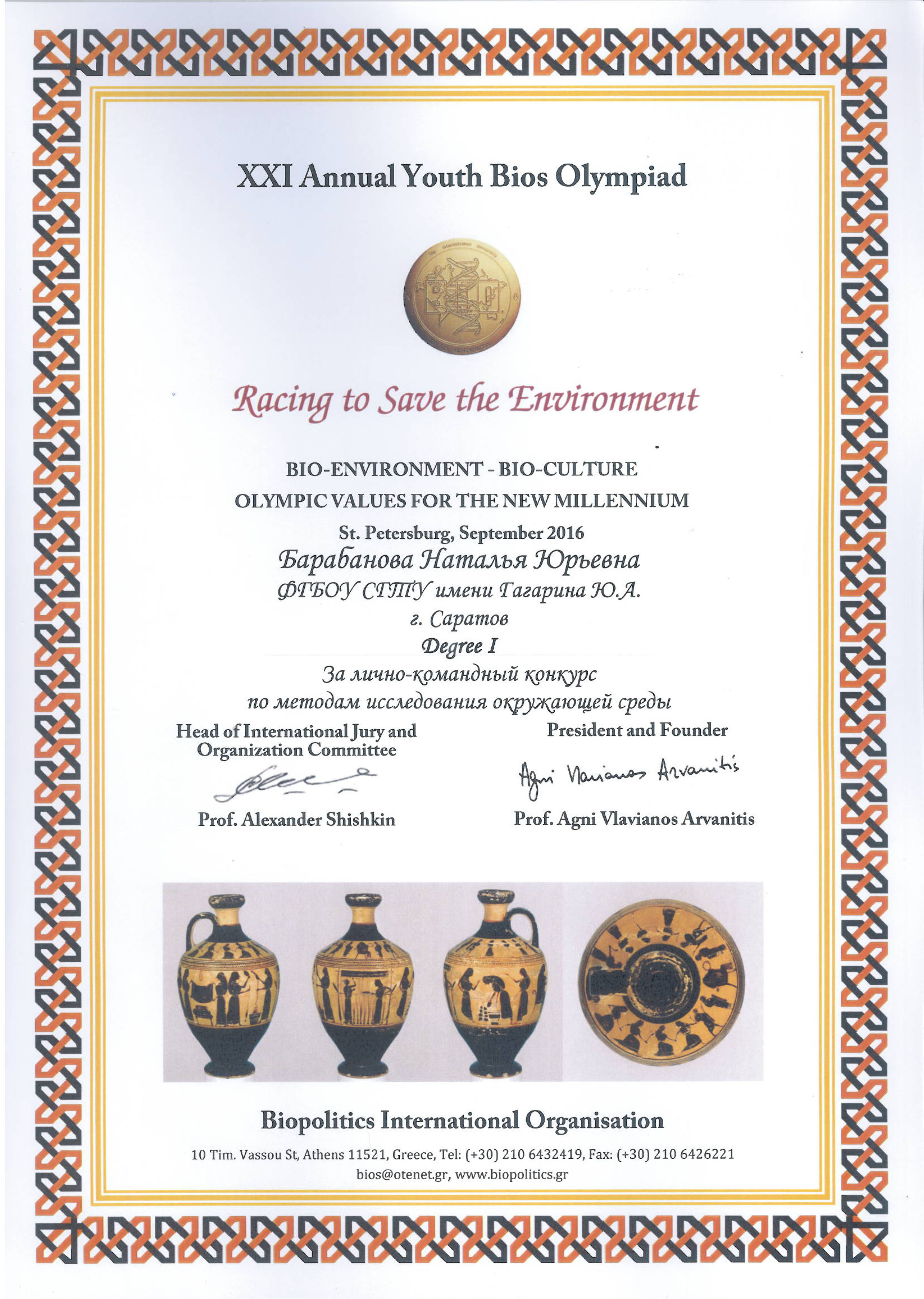 Команда обучающихся на кафедре экологии под руководством профессора Андрея Подольского с большим успехом представила Саратовский государственный технический университет имени Гагарина Ю.А. на ХХI Международном Биос-форуме и ХХI Международной Биос-олимпиаде. Около 600 участников из Сербии, Финляндии, Греции и различных регионов России приняли участие в этих международных конкурсных мероприятиях, проводившихся 14-20 августа 2016 г. в г. Санкт-Петербурге на базе Санкт-Петербургского научного центра РАН, Санкт-Петербургского политехнического университета Петра Великого и Санкт-Петербургского государственного университета промышленных технологий и дизайна.