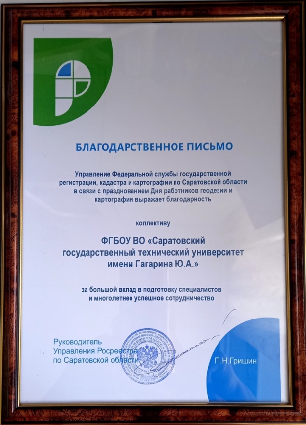 12 марта в управлении федеральной службы государственной регистрации, кадастра и картографии по Саратовской области (Росреестр) состоялось мероприятие, посвященное Дню работников геодезии и картографии. В его работе приняли участие сотрудники Росрестра, преподаватели и студенты средних и высших учебных заведений, в которых проводится подготовка специалистов, занятых в сфере управления земельно-имущественным комплексом области. От нашего ВУЗа в мероприятии приняли участие студенты групп б1-ЗМКД-11, б1-ЗМКД-21 и доцент кафедры «Геоэкология и инженерная геология» Шпортько О.Н. За большой вклад в подготовку специалистов и многолетнее успешное сотрудничество коллектив Саратовского государственного технического университета имени Гагарина Ю.А. был отмечен Благодарственным письмом.