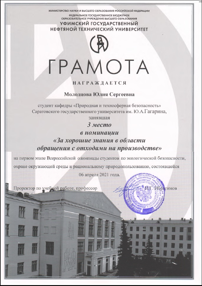 Молодцова Юлия (студент группы б-ТХНБ41) стала призёром олимпиады в личном зачете, заняв 3 место в номинации «Хорошие знания в области обращения с отходами на производстве».