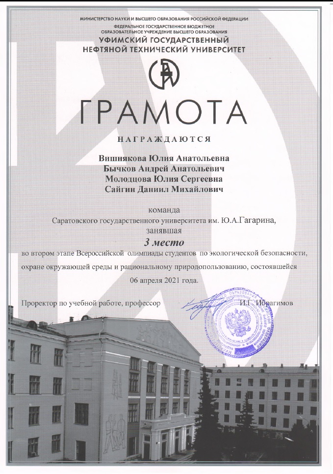 Студенты направления «Техносферная безопасность» Вишнякова Юлия, Бычков Андрей, Молодцова Юлия и Сайгин Данила под руководством доцента кафедры «Экология и техносферная безопасность» Арефьевой Оксаны заняли общекомандное 3 место во Всероссийской олимпиаде студентов по экологической безопасности, охране окружающей среды и рациональному природопользованию, организатором которой выступала кафедра «Прикладная экология» Уфимского государственного нефтяного технического университета.