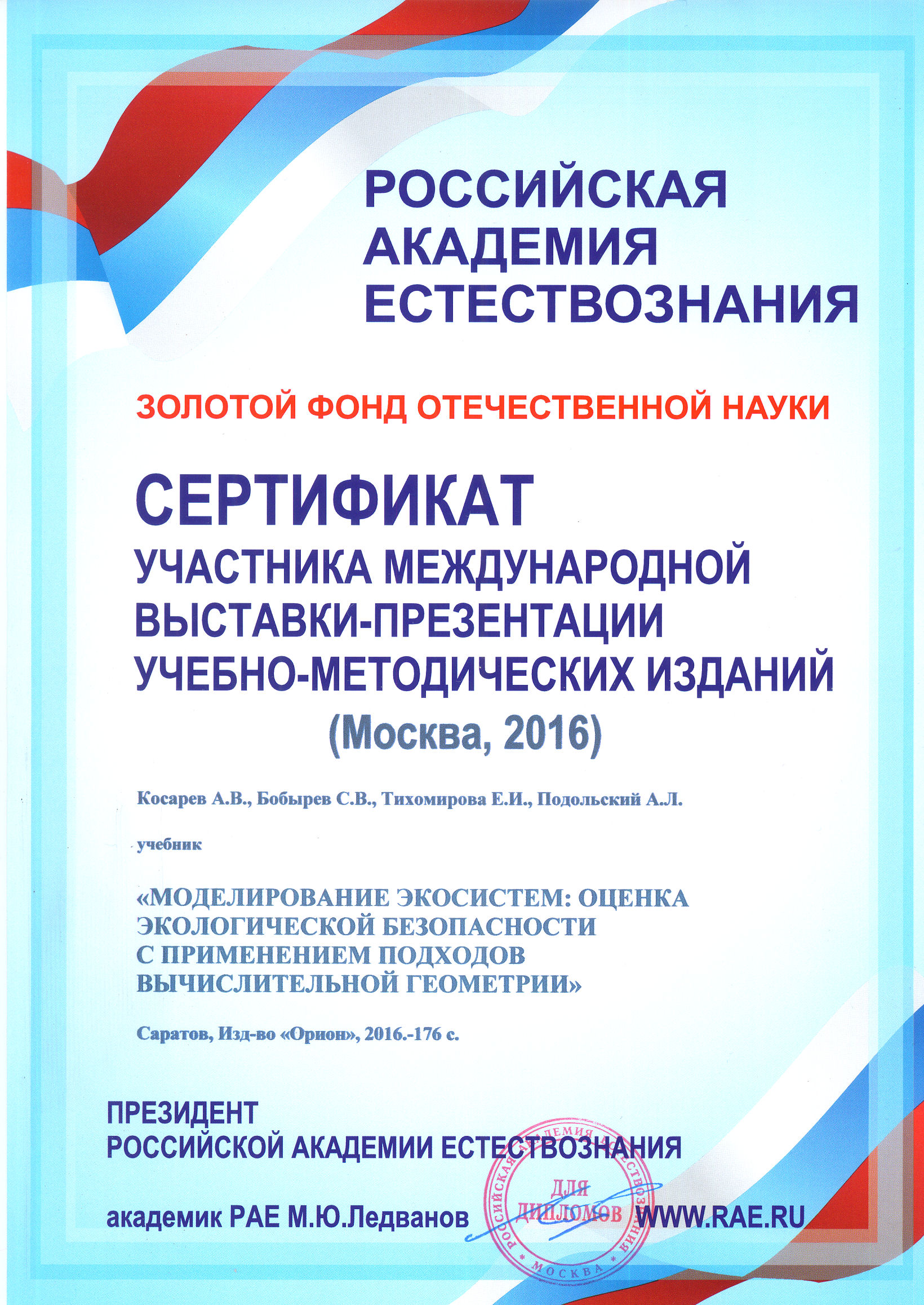 15-16 ноября в Москве состоялась Международная книжная выставка учебных пособий. Ее организатором выступила Российская академия естествознания. СГТУ имени Гагарина Ю.А. на этой выставке принял участие доцент ЭКЛ Антон Косарев, который представил учебник «Моделирование экосистем: оценка экологической безопасности с применением подходов вычислительной геометрии: учебник// С.В. Бобырев, А.В. Косарев, Е.И. Тихомирова, А.Л. Подольский; СГТУ имени Гагарина Ю.А.-Саратов: Орион, 2016.-176с.: ил.-ISBN 978-5-7433-3006-5».