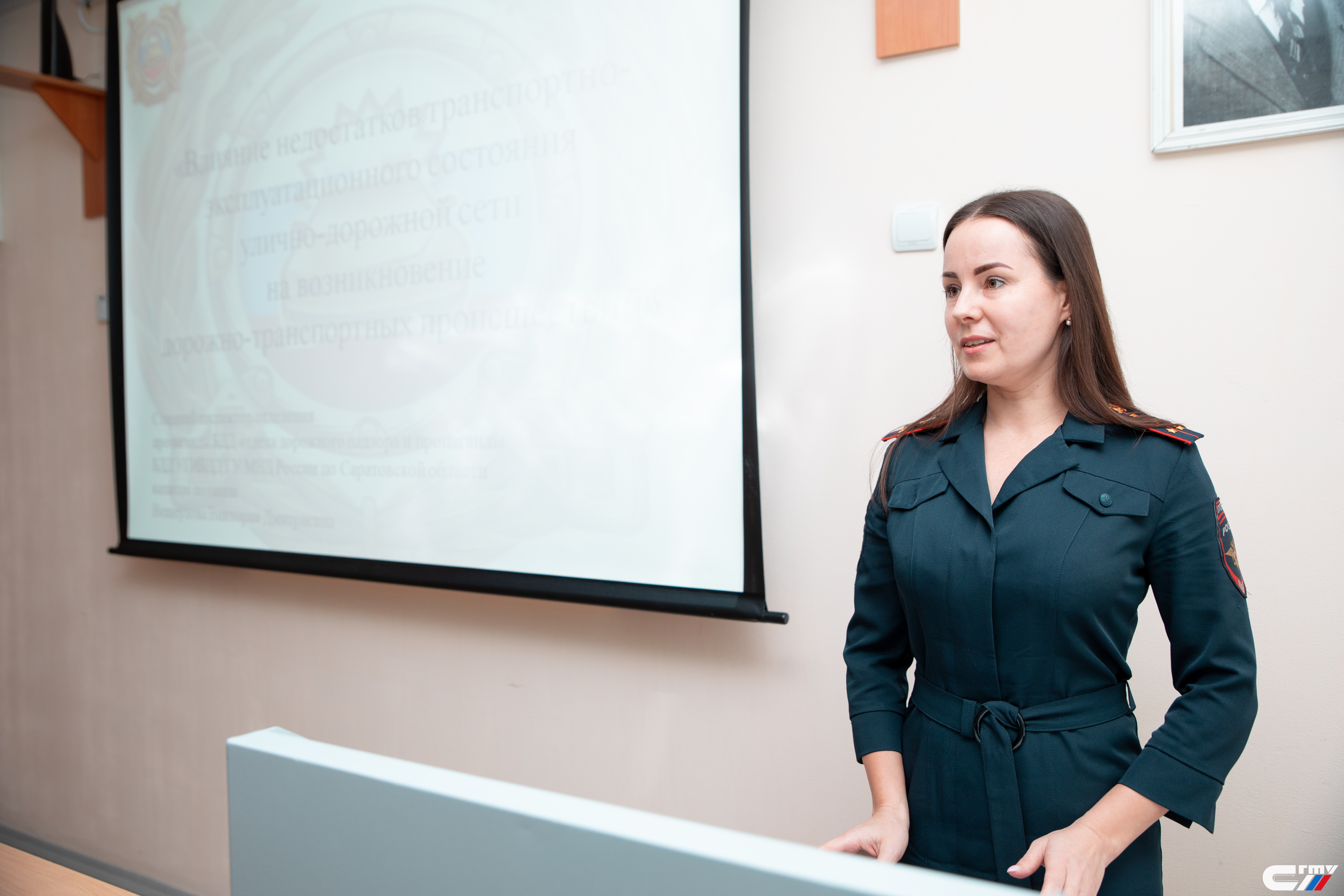 Старший инспектор пропаганды безопасности дорожного движения управления ГИБДД по Саратовской области, капитан полиции Виктория Вещеулова в своем докладе осветила вопросы, связанные с безопасностью дорожного движения. Особое внимание было уделено аварийности, причинам возникновения ДТП, дорожной разметке, светофорному регулированию, ограждающим устройствам и способам повышения безопасности движения.