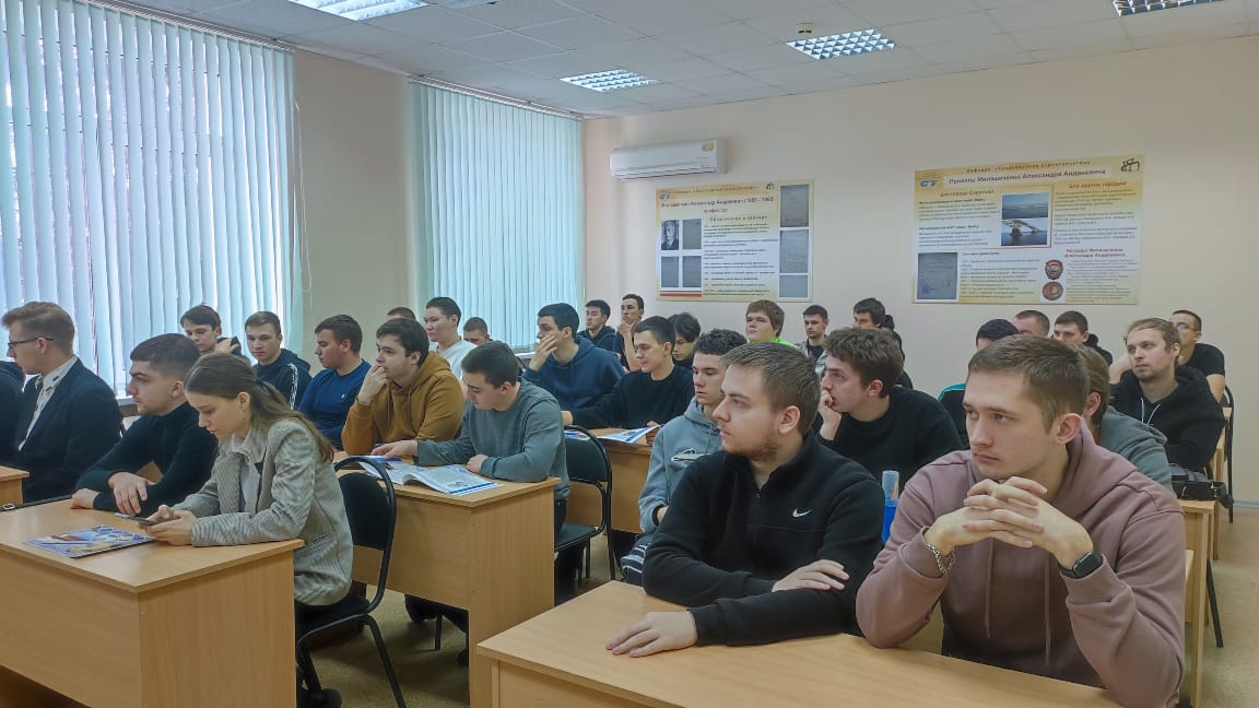 В марте с выпускниками направления «Строительство» профилей «Автомобильные дороги, аэродромы и объекты транспортной инфраструктуры» и «Объекты транспортной инфраструктуры (мосты и транспортные тоннели)» встретились генеральный директор ООО «Саратовзапсибниипроект-2000» Александр Дегтярев и его заместитель Сергей Лазарев.