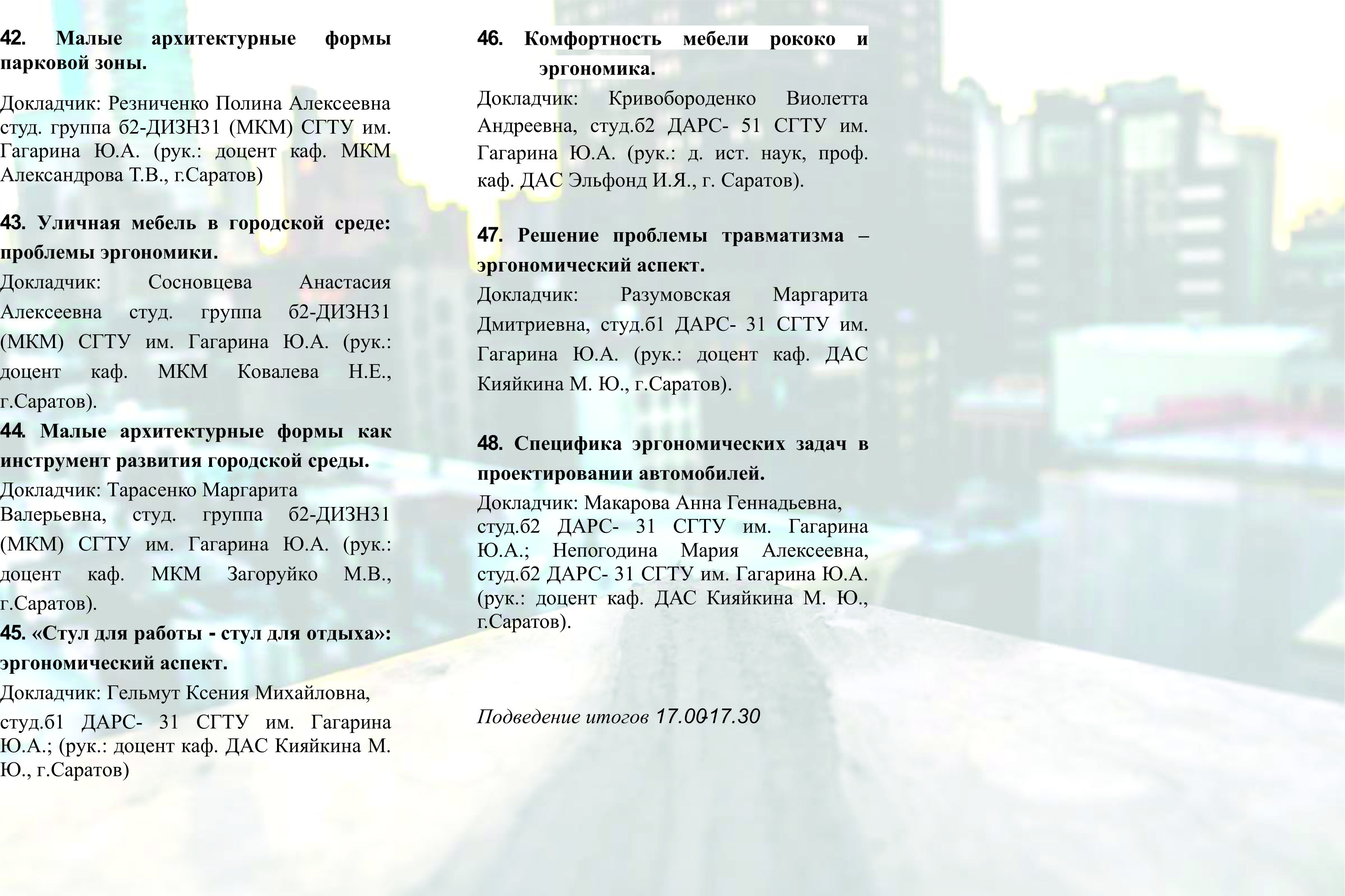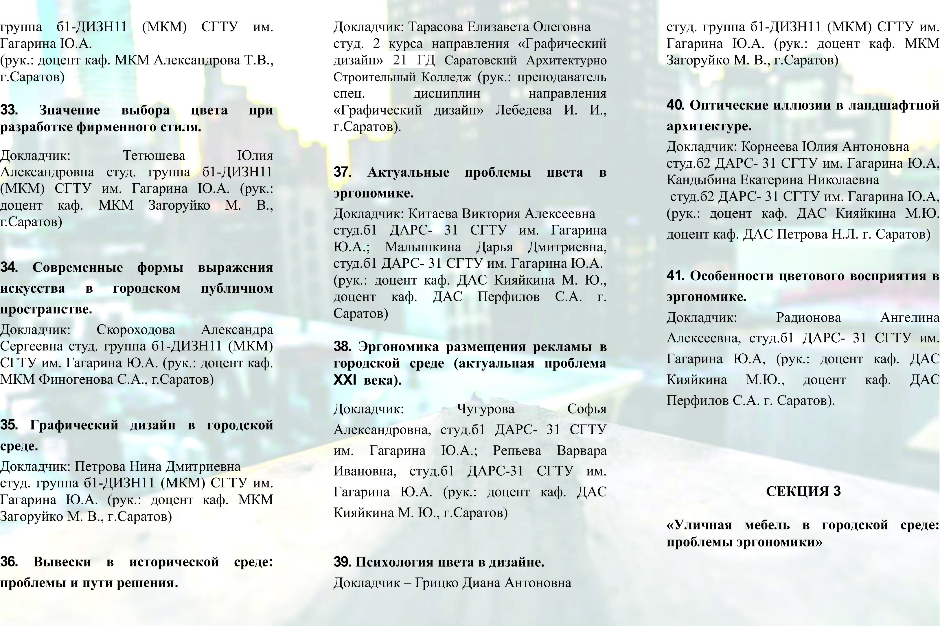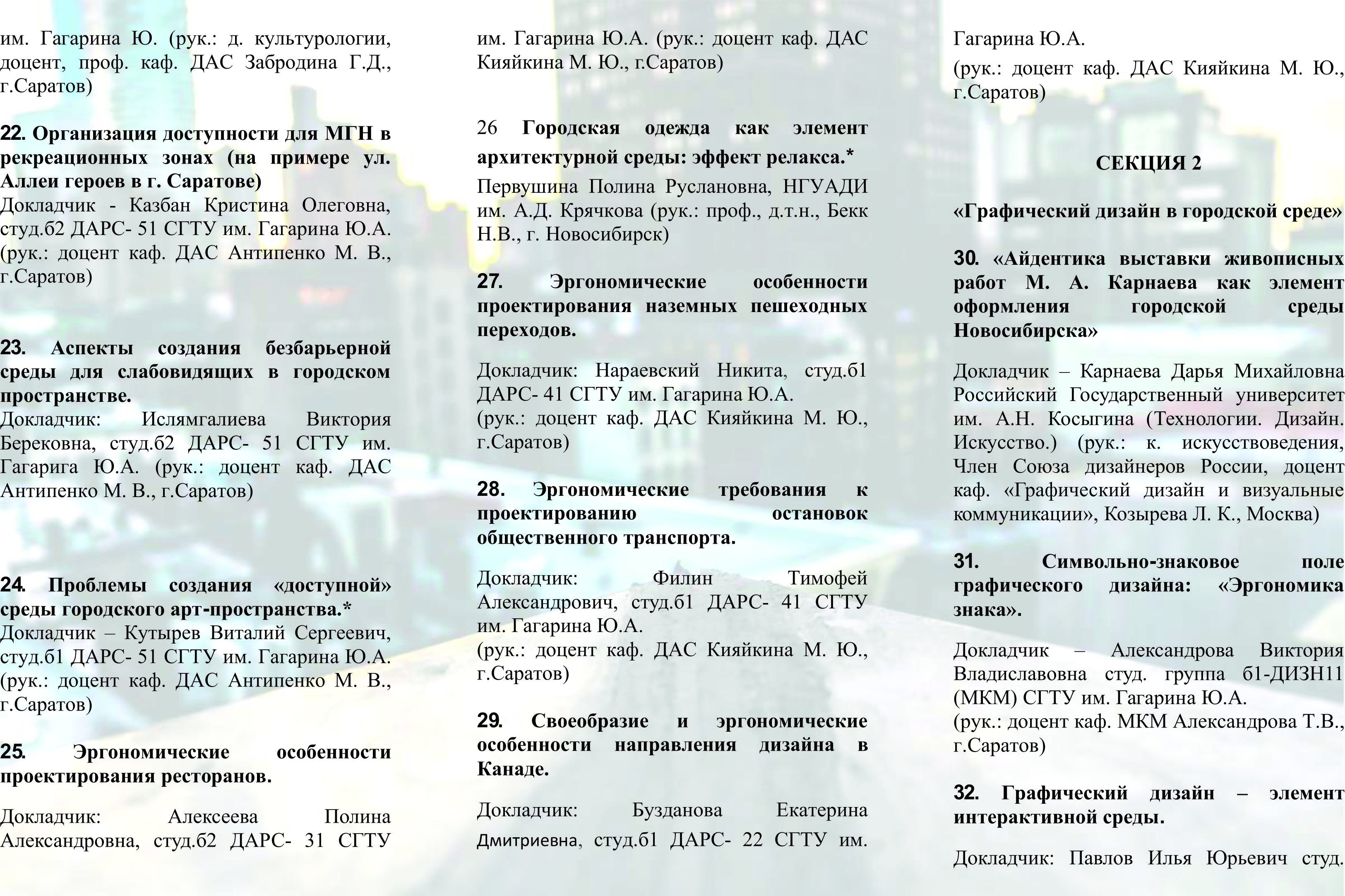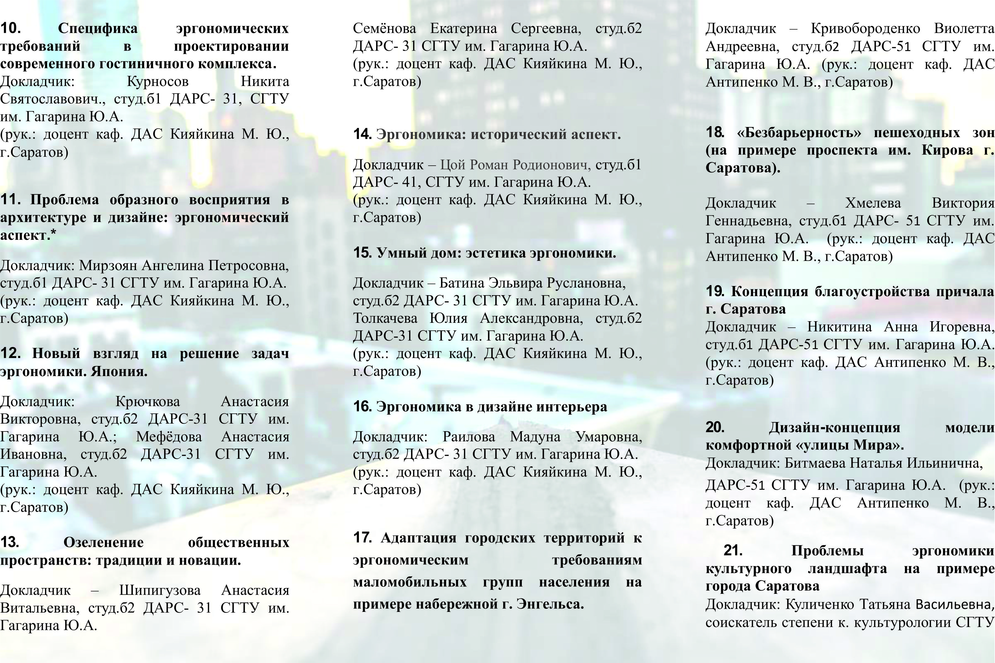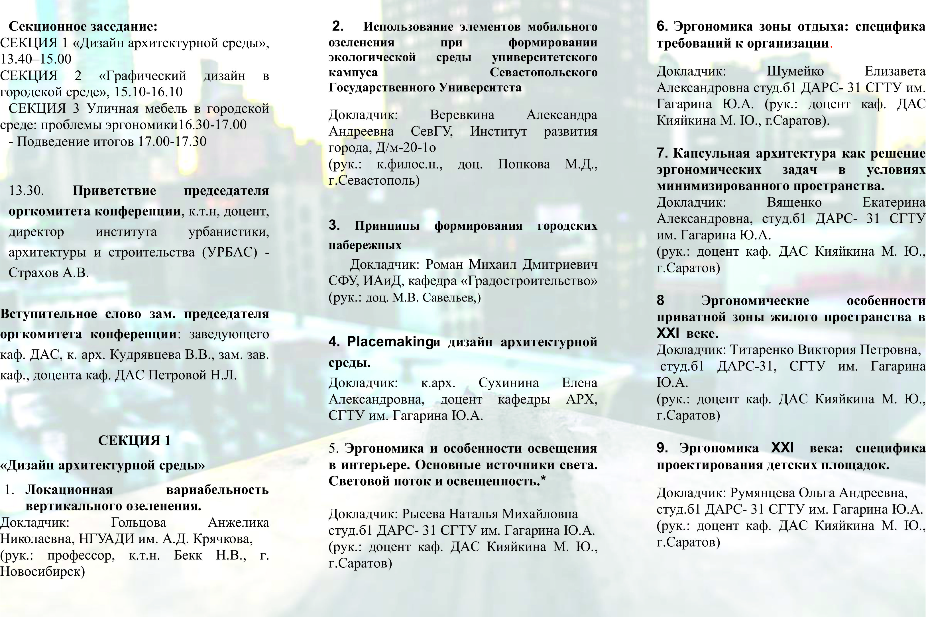 Представленные доклады были посвящены широкому спектру вопросов эргономики в дизайне архитектурной среды и затрагивали актуальные и насущные проблемы современного общества.