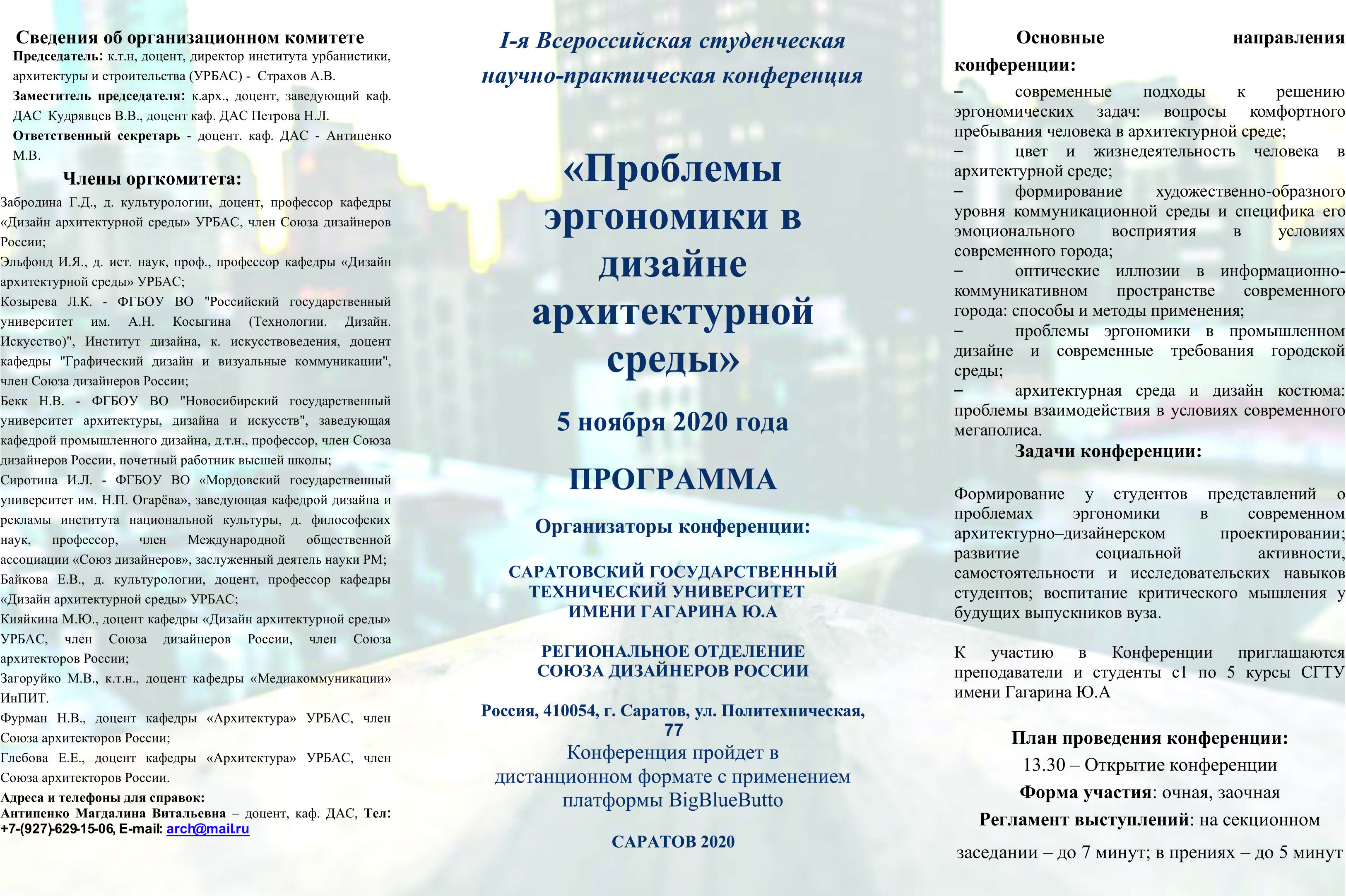 5 ноября 2020 года на кафедре «Дизайн архитектурной среды» УРБАС состоялась I Всероссийская студенческая научно-практическая конференция «Проблемы эргономики в дизайне архитектурной среды».