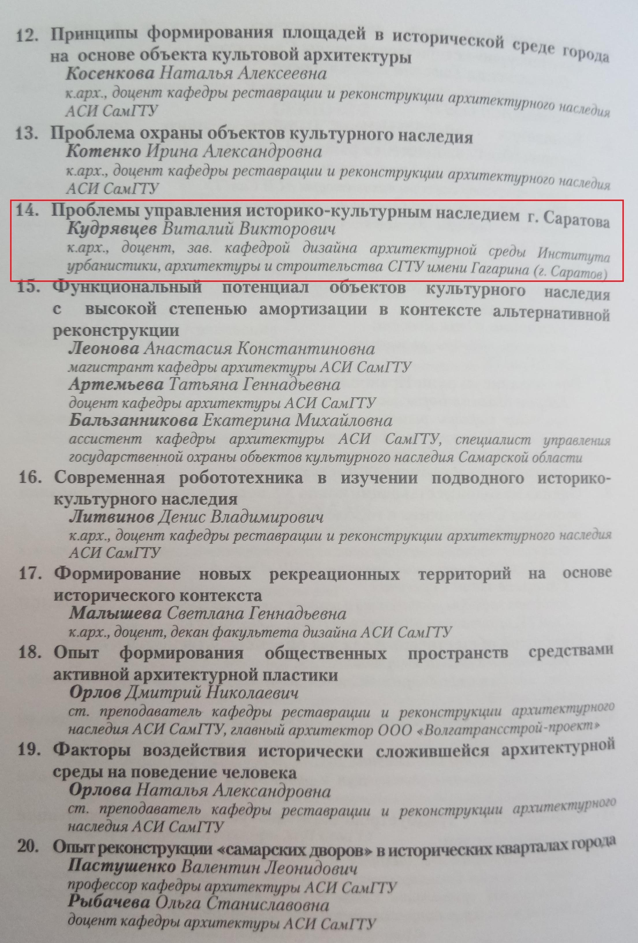 Тема доклада заведующего кафедрой ДАС УРБАС СГТУ имени Гагарина Ю.А. Кудрявцева Виталия Викторовича «Проблемы управления историко-культурным наследием г. Саратова»