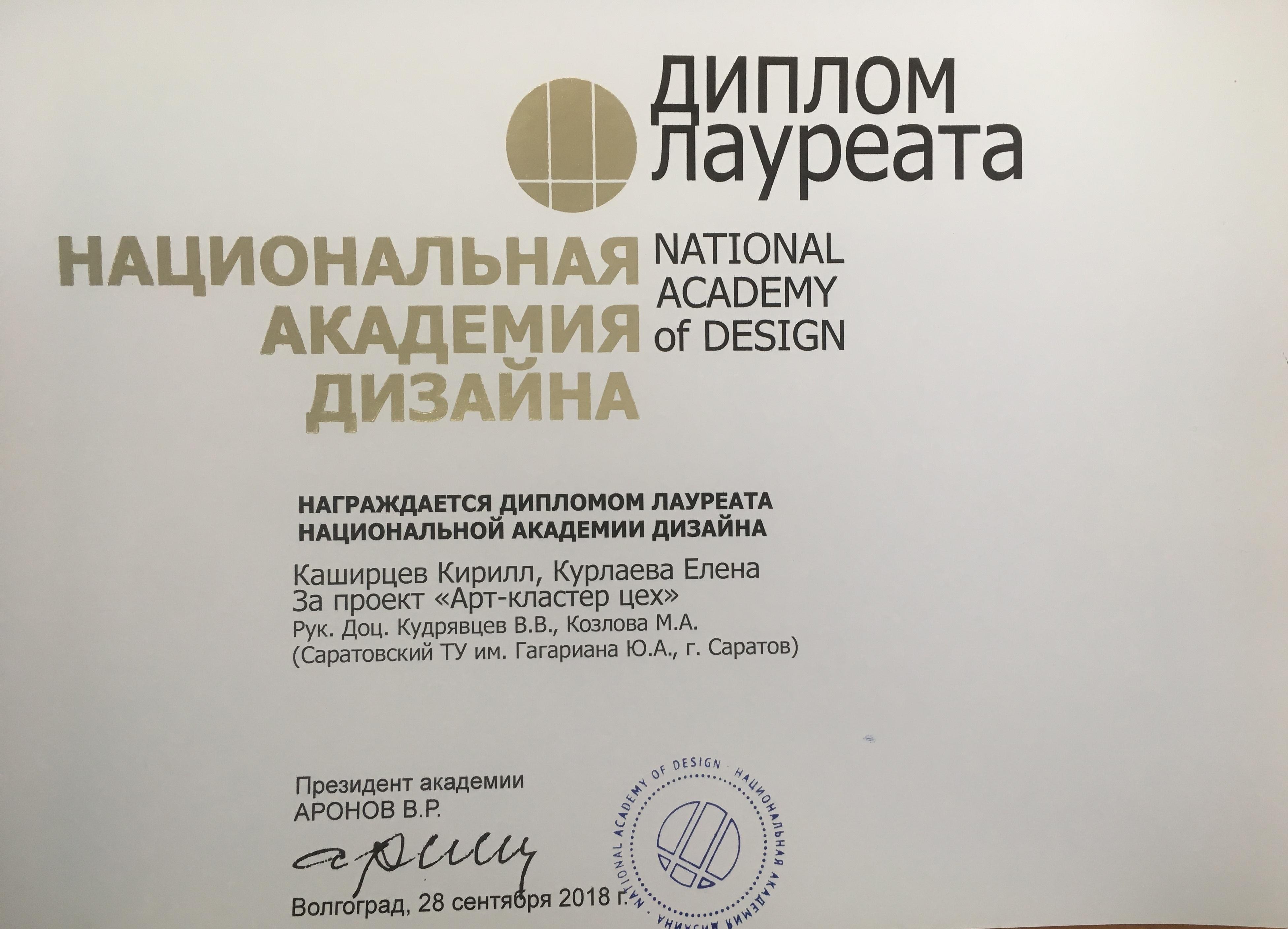 Дипломный проект выпускники 2018 года Каширцева Кирилла и Курлаевой Елены "Арт-кластер "Цех" был отмечен на всероссийском смотре-конкурсе дипломных проектов, проходившем в Волгограде в сентябре 2018 года, и стал лауреатом Национальной Академии дизайна