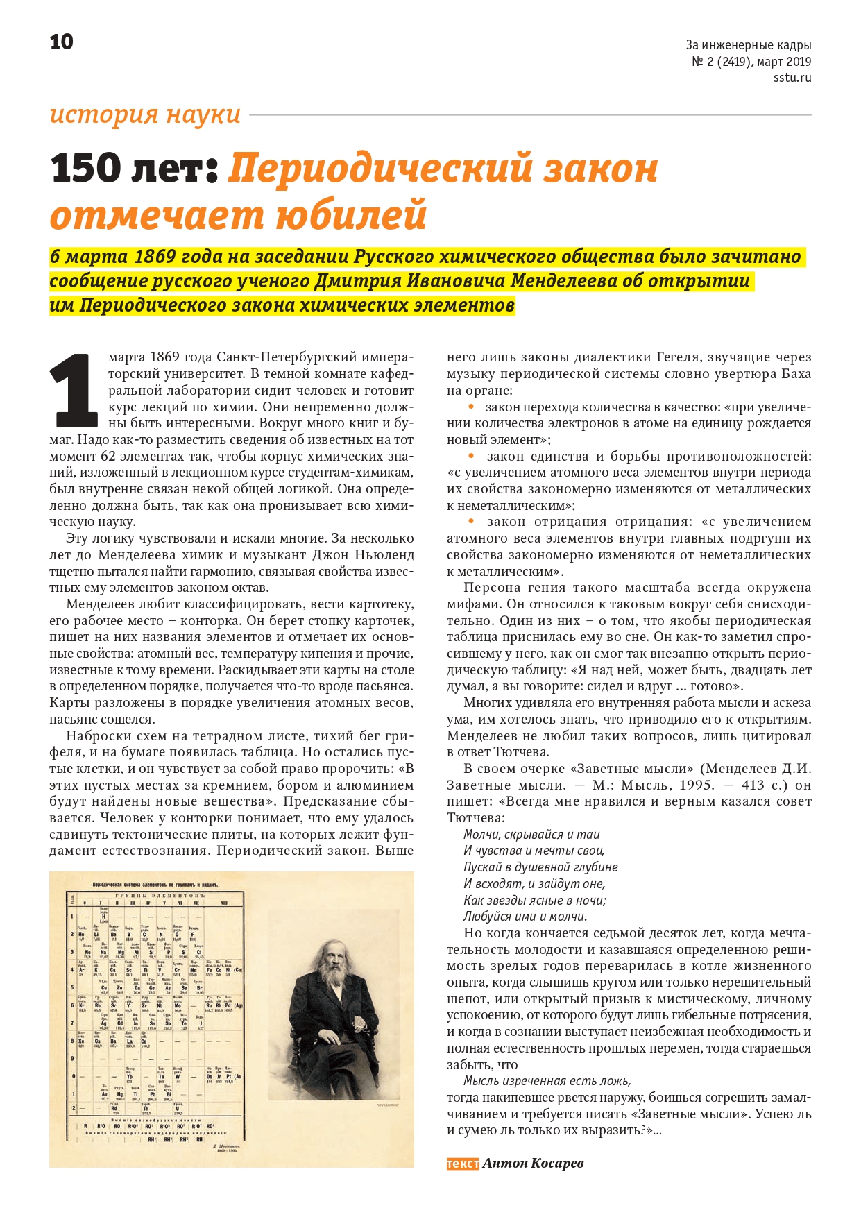 А. Косарев. 150 лет: Периодический закон отмечает юбилей //За инженерные кадры.-2019.-№2(2419).-С.10