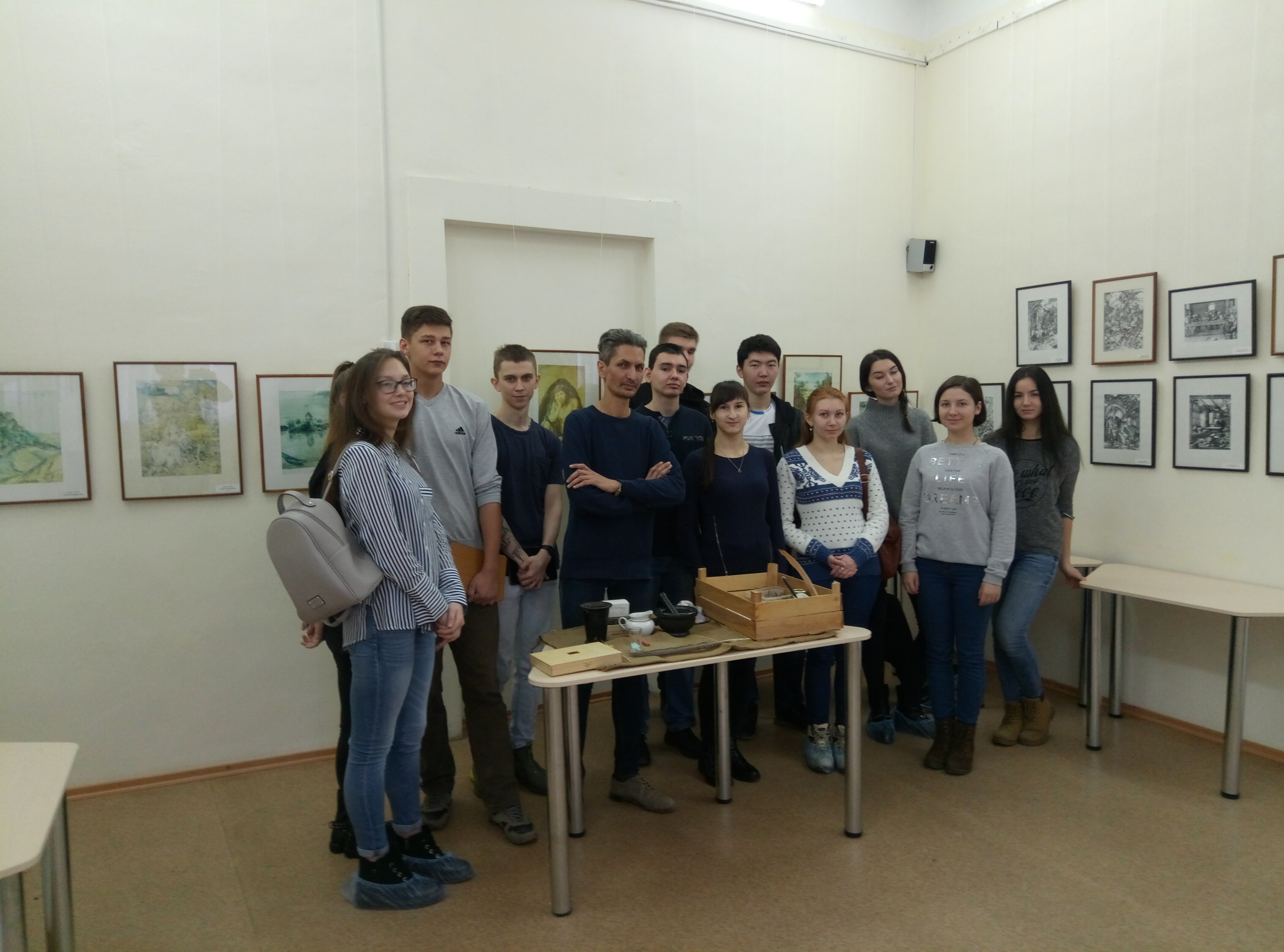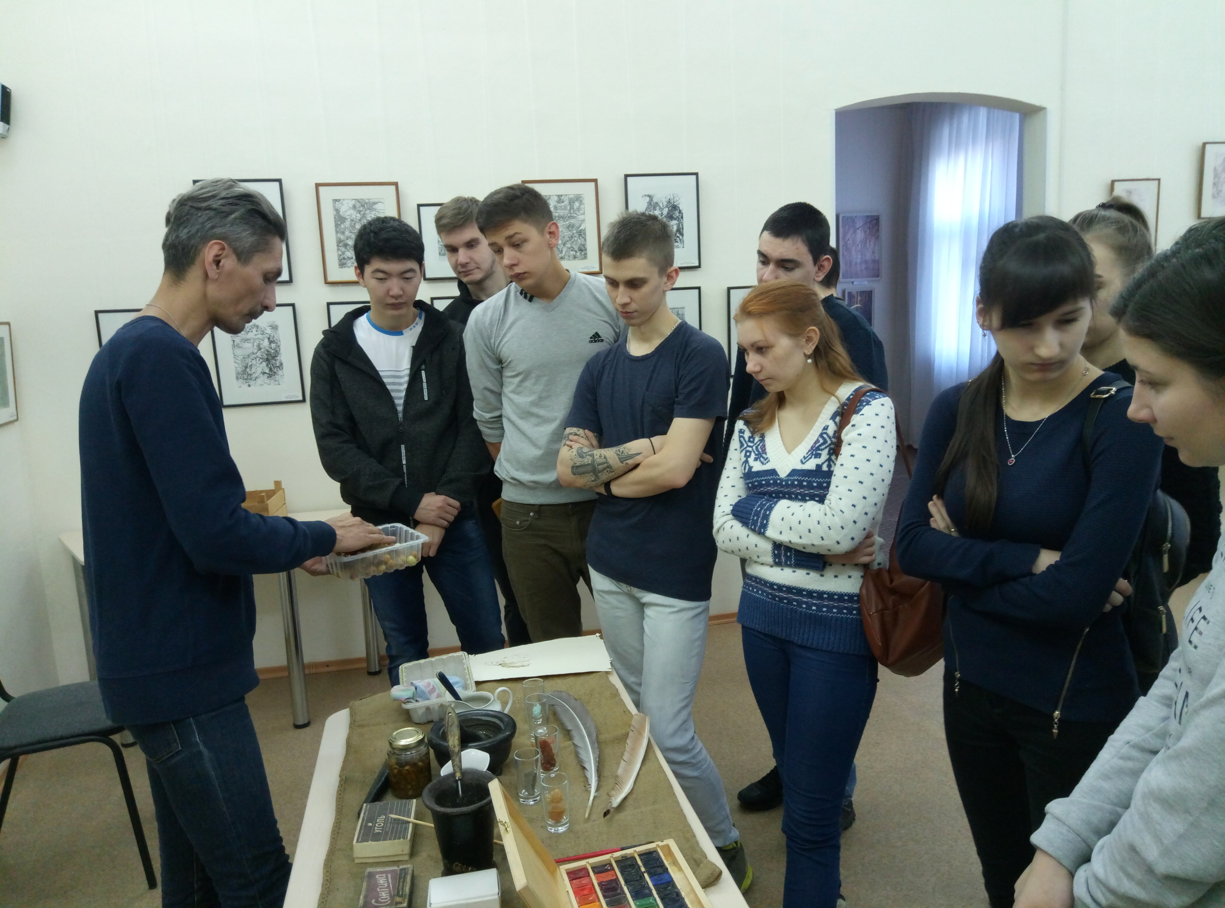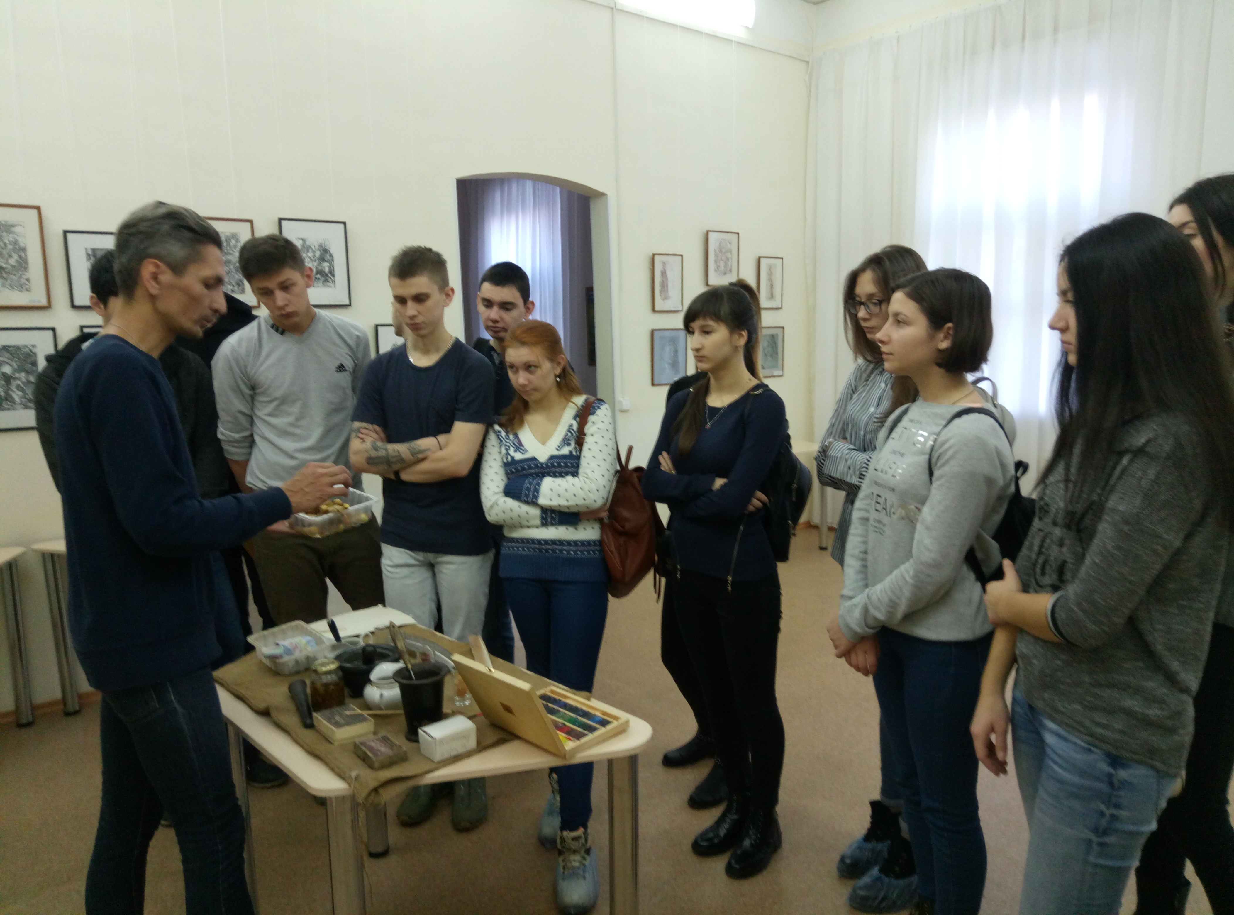 16 ноября студенты группы бЭКЛП-41 вместе с преподавателем Ириной Тарасовой посетили культурно-выставочный центр "Радуга". Для них известный саратовский художник Роман Белянин провел мастер -класс по изготовлению красок из природных материалов: уголь, сепия, сангина и др. Древние люди изображали на камнях то, что их окружало: бегущих животных и охотников с копьями. Средневековые художники тоже готовили краски сами, смешивая порошки пигментов и жиры. Такие краски нельзя было хранить дольше одного дня, так как при контакте с воздухом они окислялись и затвердевали. И в настоящее время картины, написанные натуральными красками, радуют эстетическое восприятие. Кроме того, студенты-экологи познакомились с репродукциями полотен знаменитого немецкого живописца XIV-XV в.в. Альбрехта Дюрера, применившего ксилографию (искусство письма по дереву) в художественном творчестве западно-европейского Ренессанса. Экскурсия вызвала большой интерес и способствовала углублению знаний, полученных при изучении дисциплины "Экология и культура".