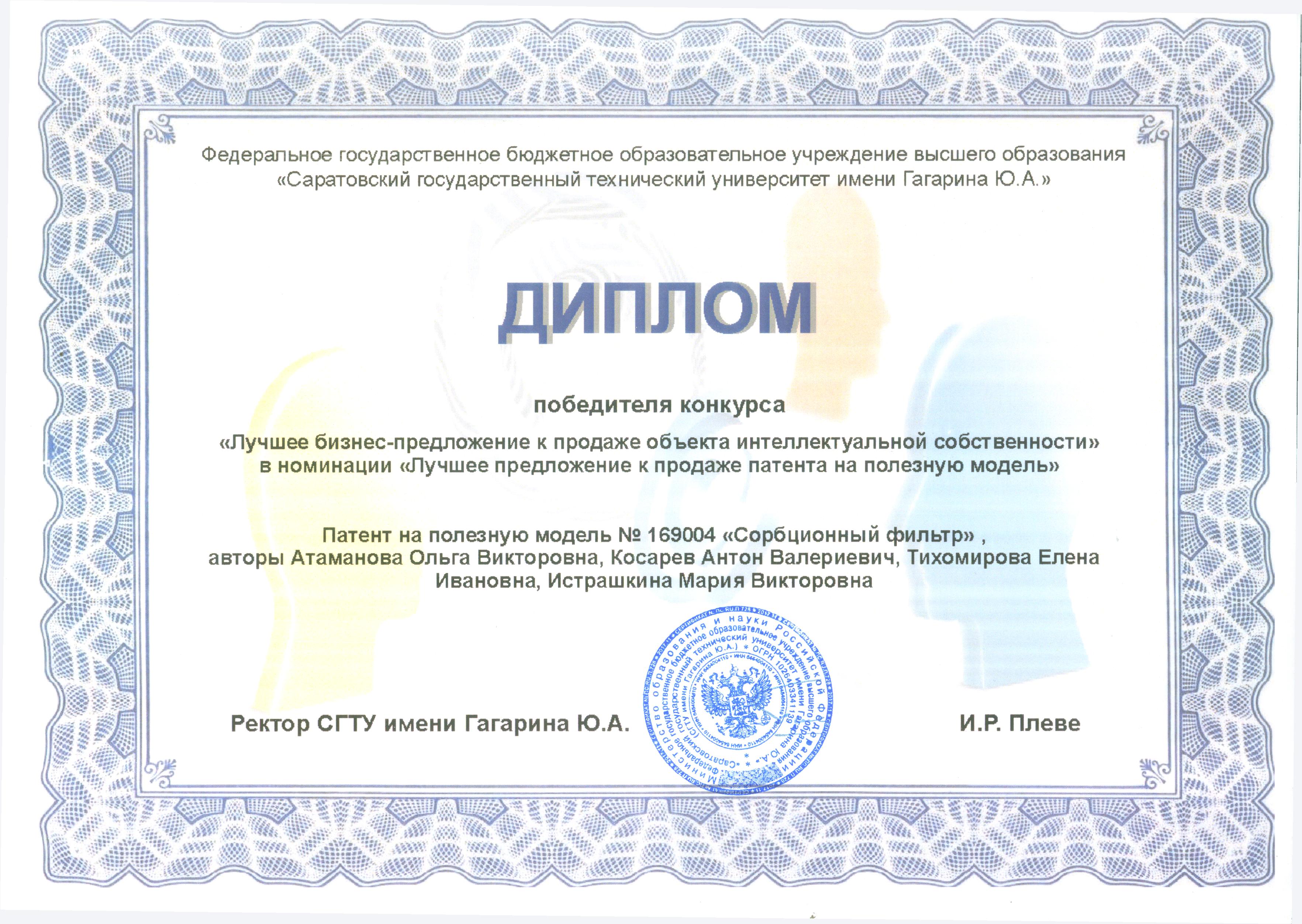 подведение итогов конкурса «Лучшее бизнес-предложение объекта интеллектуальной собственности», проводимого в СГТУ имени Гагарина Ю.А. Конкурсная комиссия высоко оценила потенциал поданных заявок и определила пять проектов-победителей. В номинации «Лучшее предложение к продаже патента на полезную модель» победителем стал патент на полезную модель № 169004 «Сорбционный фильтр», авторами которого являются ученые ЭКЛ - профессор Ольга Атаманова, доцент Антон Косарев, профессор Елена Тихомирова, аспирант Мария Истрашкина.