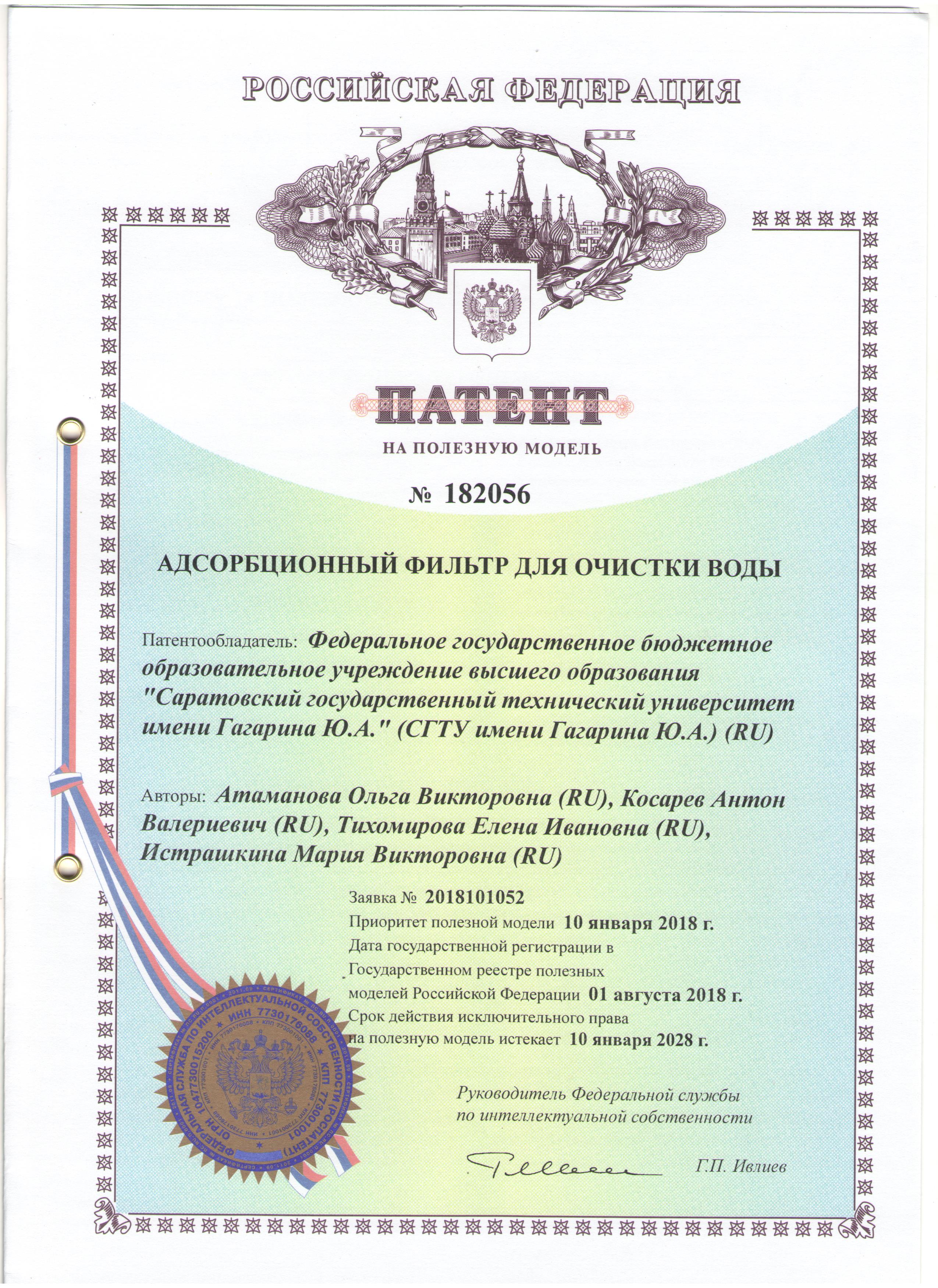 Ученые СГТУ имени Гагарина Ю.А. кафедры «Экология» (ЭКЛ) - профессор Ольга Атаманова, доцент Антон Косарев, профессор Елена Тихомирова и аспирант Мария Истрашкина - получили патент на полезную модель «Адсорбционный фильтр для очистки воды».