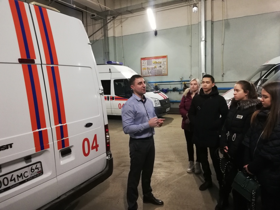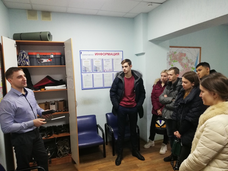 В дальнейшем заместителем начальника центральной аварийно-диспетчерской службы Игнатьевы П. С. была проведена экскурсия в помещения аварийно-диспетчерской службы АО «Саратовгаз».  Студентов ознакомили с основными задачами аварийно-диспетчерской службы, порядком приема, регистрации и обработки заявлений об утечках газа, методами и средствами оперативно-диспетчерского контроля газорегуляторных пунктов, особенностями локализации и ликвидации аварийных ситуаций в газовых хозяйствах города, показали оснащение «Аварийно-спасательной службы АО «Саратовгаз» на базе автомобилей «Газель» и «Mersedes», используемых службой для доставки специалистов на место утечек газа с последующей ликвидацией аварии.