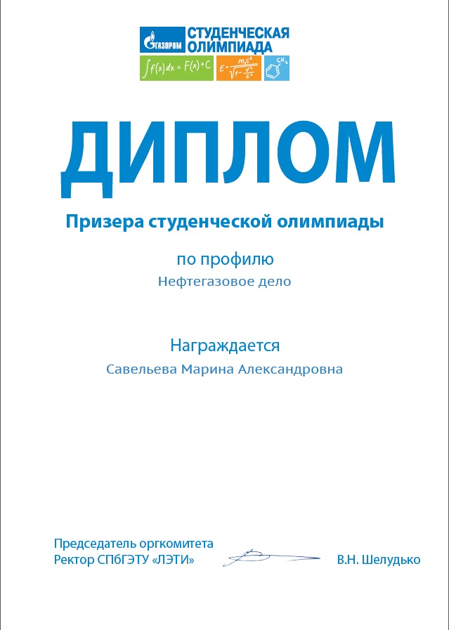 Савельева Марина Александровна - призер очного этапа Всероссийской студенческой олимпиады "Газпром" по направлению "Нефтегазовое дело"