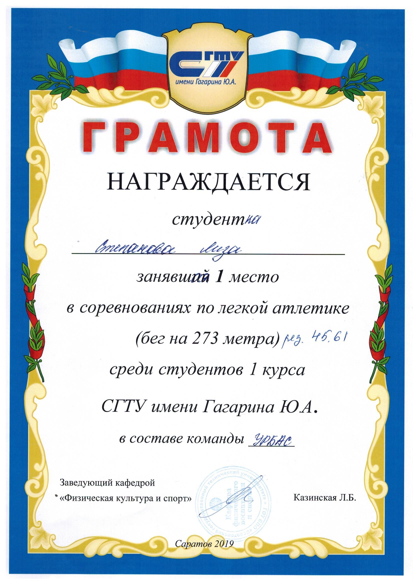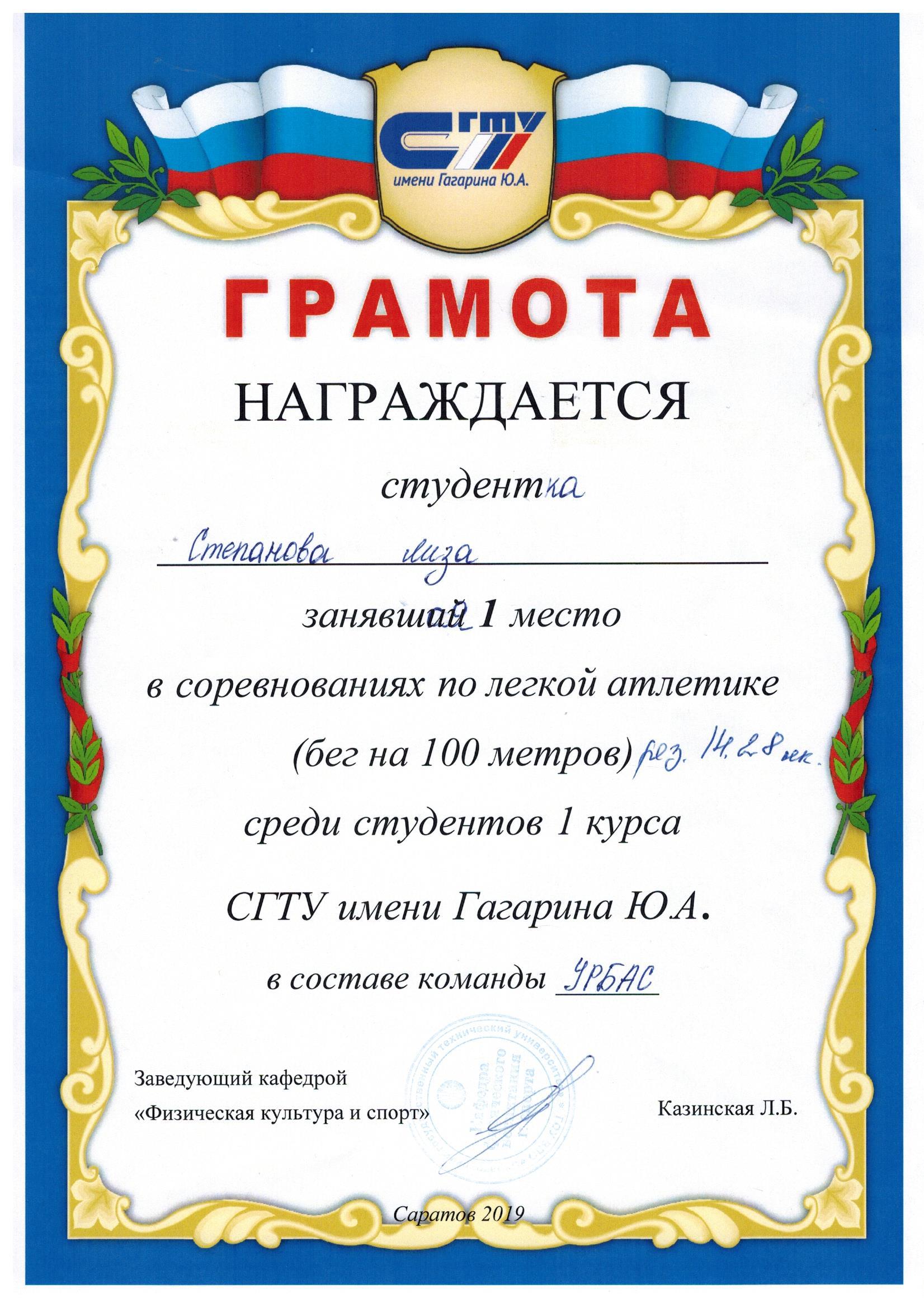 Студентка группы б3-НФГД-11 Степанова Лиза приняла участие в соревнованиях. По результатам спартакиады была награждена грамотами за I место в следующих номинациях: эстафета, бег на 100 метров, бег на 273 метра. Поздравляем и желаем дальнейших спортивных побед!