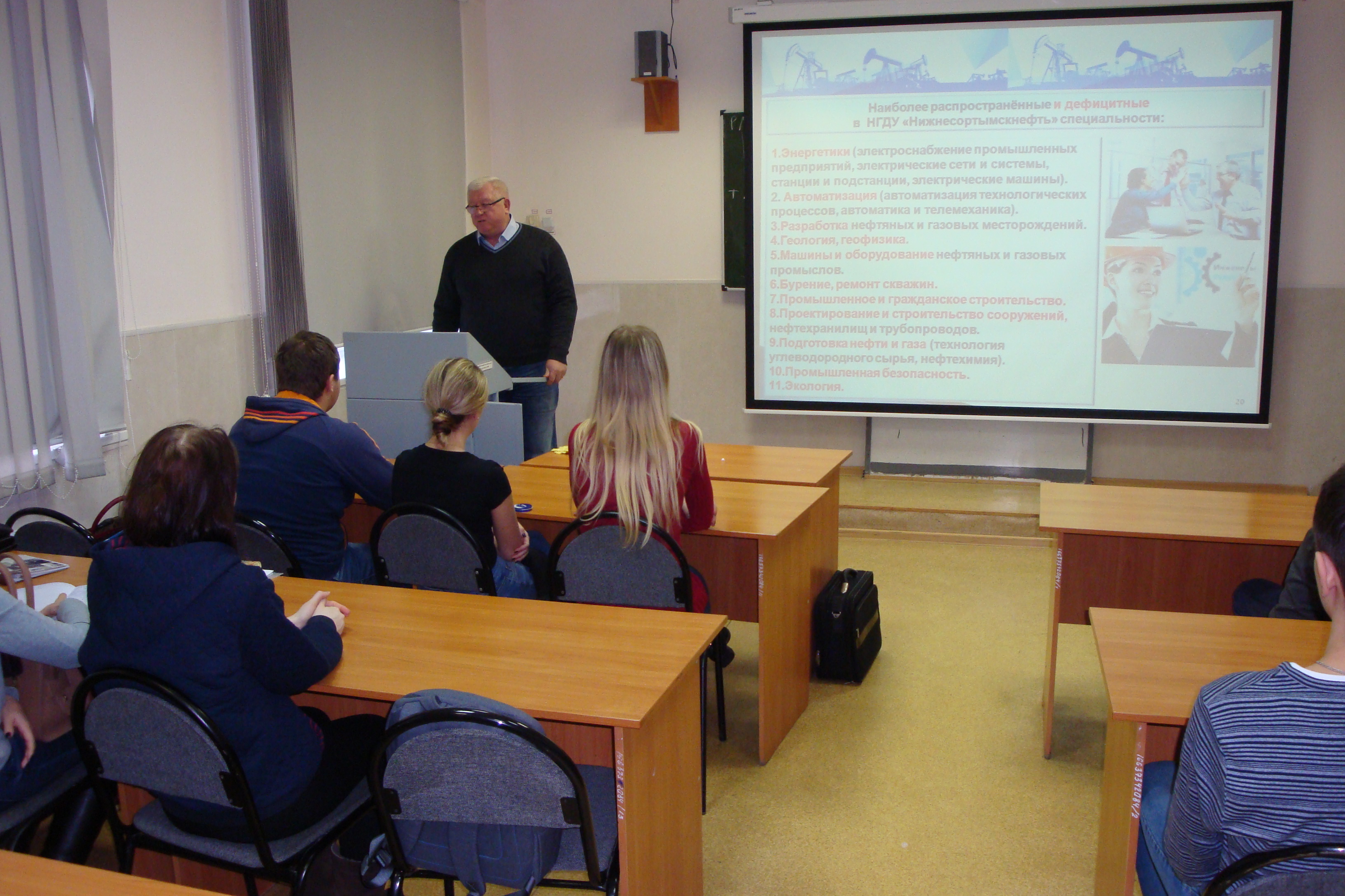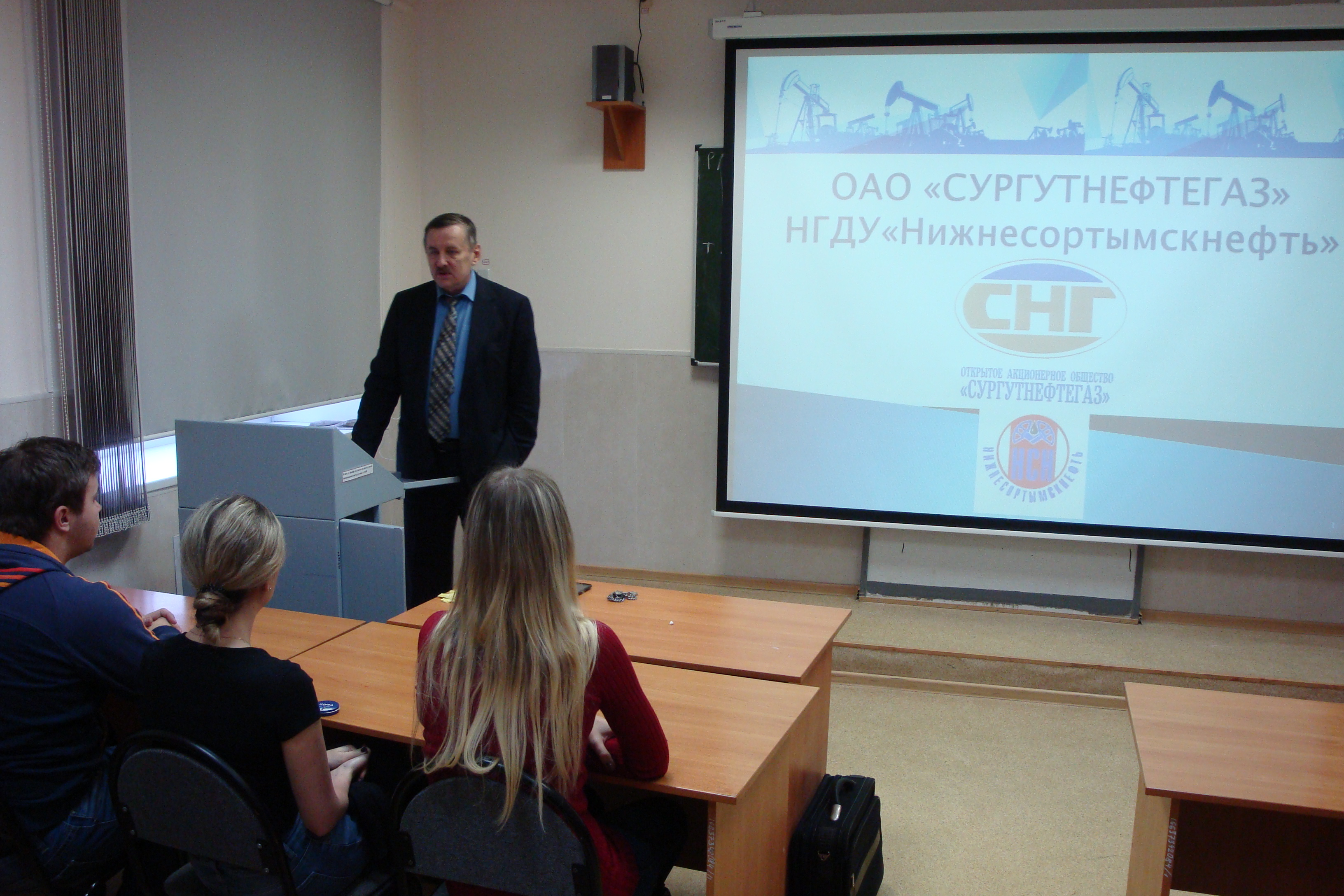 В ходе встречи студентам рассказали о вакансиях, основных направлениях и условиях работы в одной из крупнейших нефтегазовых компаний России, ОАОСургутнефтегаз. На протяжении многих лет предприятие является лидером отрасли по разведочному, эксплуатационному бурению и вводу в эксплуатацию новых добывающих скважин. На предприятии создан первый в России полный цикл производства, переработки газа, выработки на его основе собственной электроэнергии, получения готового продукта.