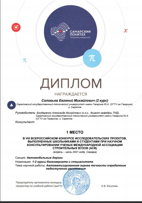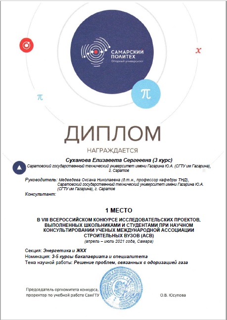 Студенты Института урбанистики, архитектуры и строительства СГТУ имени Гагарина Ю. А. заняли первые места в своих секциях на Всероссийском конкурсе исследовательских проектов, выполненных школьниками и студентами при научном консультировании ученых международной ассоциации строительных вузов АСВ (организатор – Самарский государственный технический университет).