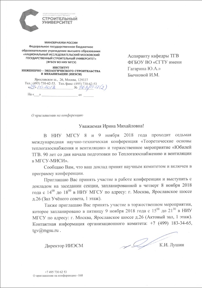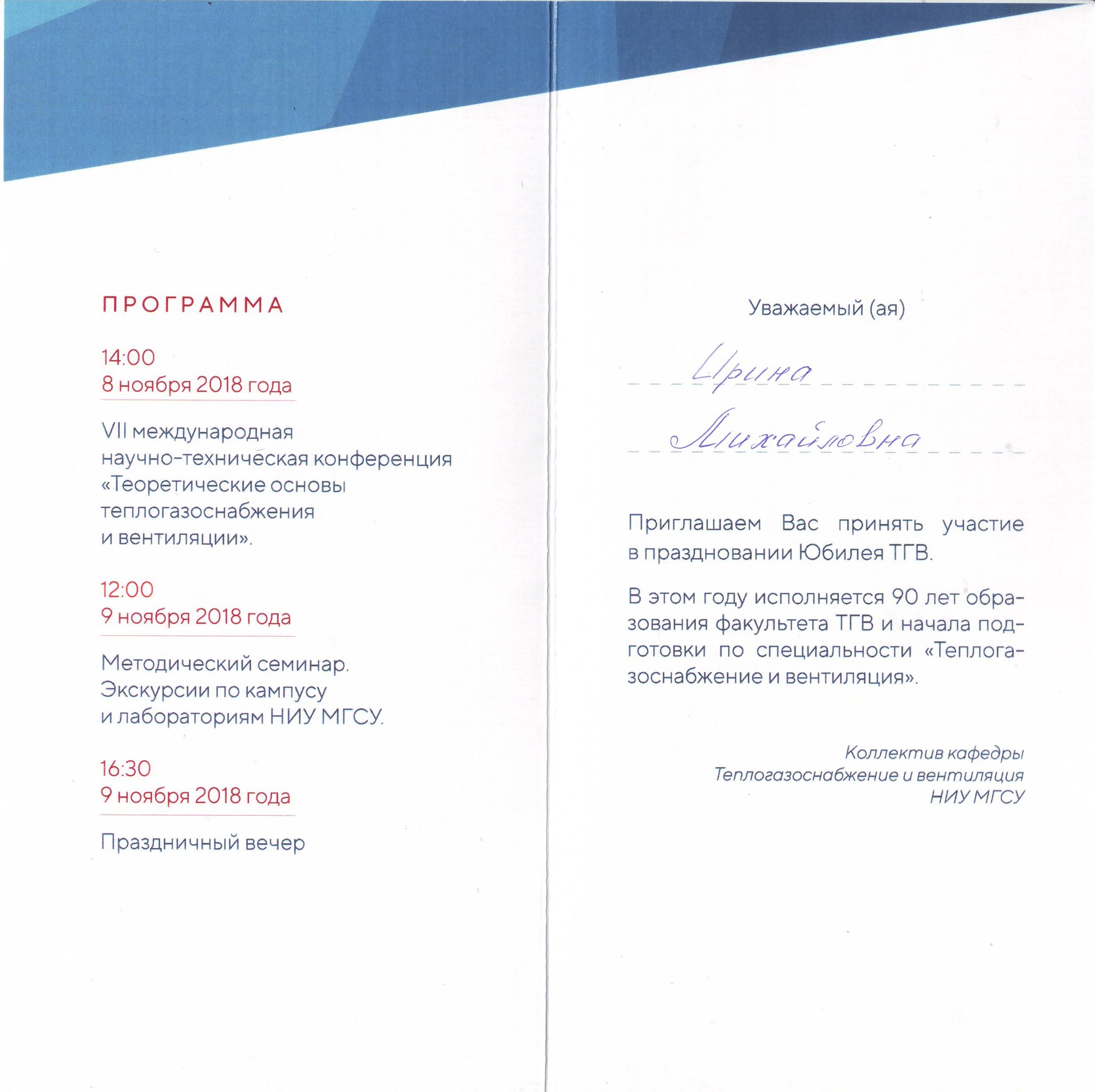 8 ноября 2018 года, аспирантка кафедры «Теплогазоснабжение, вентиляция, водообеспечение и прикладная гидрогазодинамика», Бычкова Ирина Михайловна, приняла участие в работе седьмой международной научно-технической конференции «Теоретические основы теплогазоснабжения и вентиляции», посвященной 90-летнему юбилею образования факультета "Теплогазоснабжение и вентиляция" (ТГВ) Института инженерно-экологического строительства и механизации (ИИЭСМ) Национального исследовательского Московского государственного строительного университета (НИУ МГСУ).