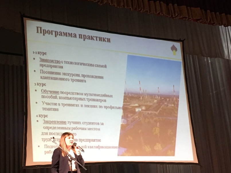 С историей завода связаны судьбы множества людей, целых рабочих династий, посвятивших свою жизнь труду в нефтеперерабатывающей отрасли. Поддержать эти замечательные традиции призван специальный проект «Шаг вперед», о котором ребятам рассказала начальник отдела оценки персонала Богданова Наталья Михайловна. Программа выстраивает многоступенчатую систему обучения будущих сотрудников, начиная с профильных классов в школах, продолжая прохождением учебных и производственных практик студентами вузов, заканчивая системой кадрового резерва и наставничества на производстве. Такой подход обеспечивает максимально эффективную интеграцию в корпоративную среду специалиста, избравшего своей профессией нефтяную отрасль.