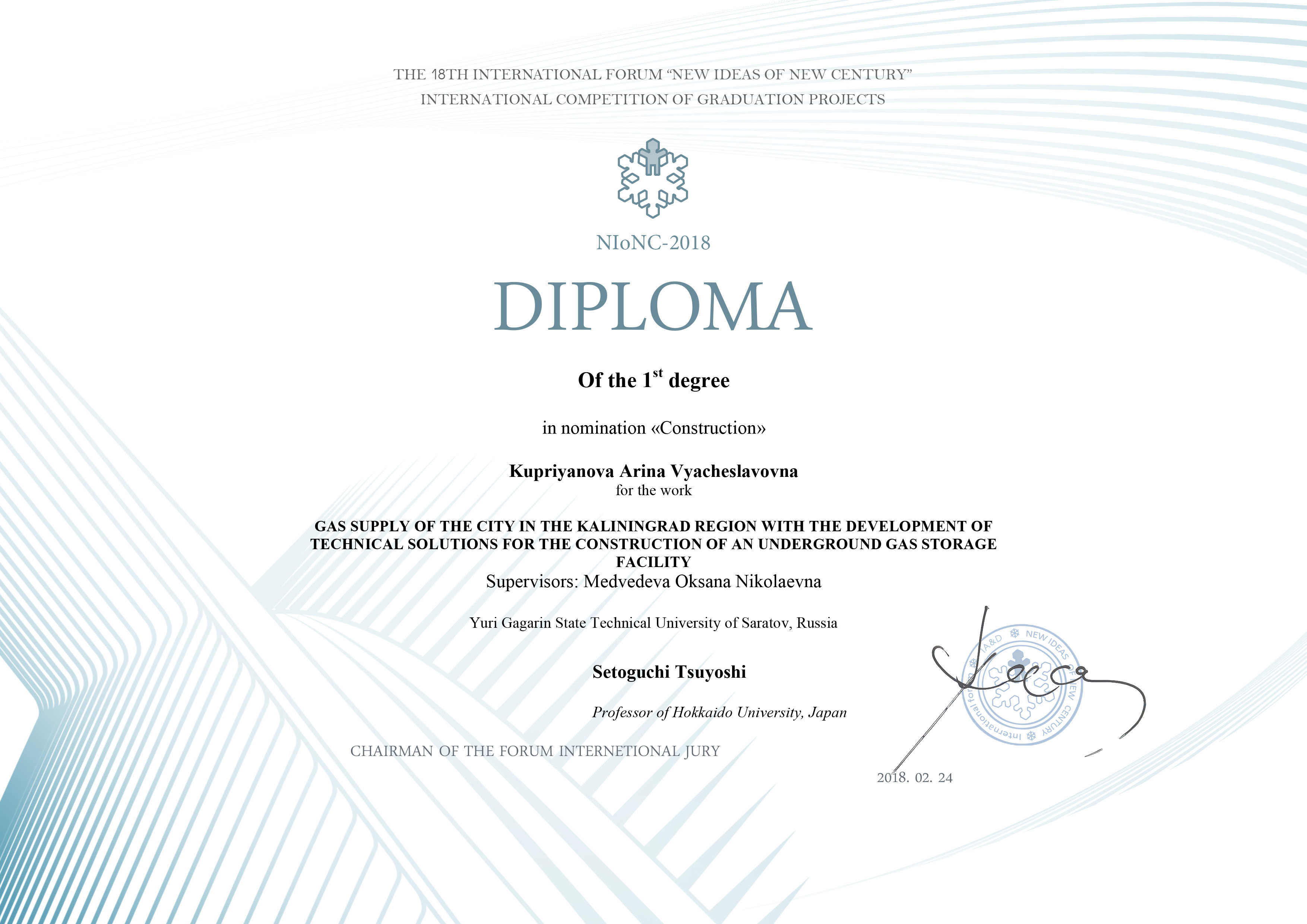 Диплом 1 степени в номинации «Строительство» (1st Degree Diplomas in nomination "Construction") получила выпускная работа бакалавра Куприяновой Арины Вячеславовны «Газоснабжение города в Калининградской области с разработкой технических решений по обустройству подземного хранилища газа», Руководитель: д.т.н., профессор кафедры ТГВ Медведева Оксана Николаевна.