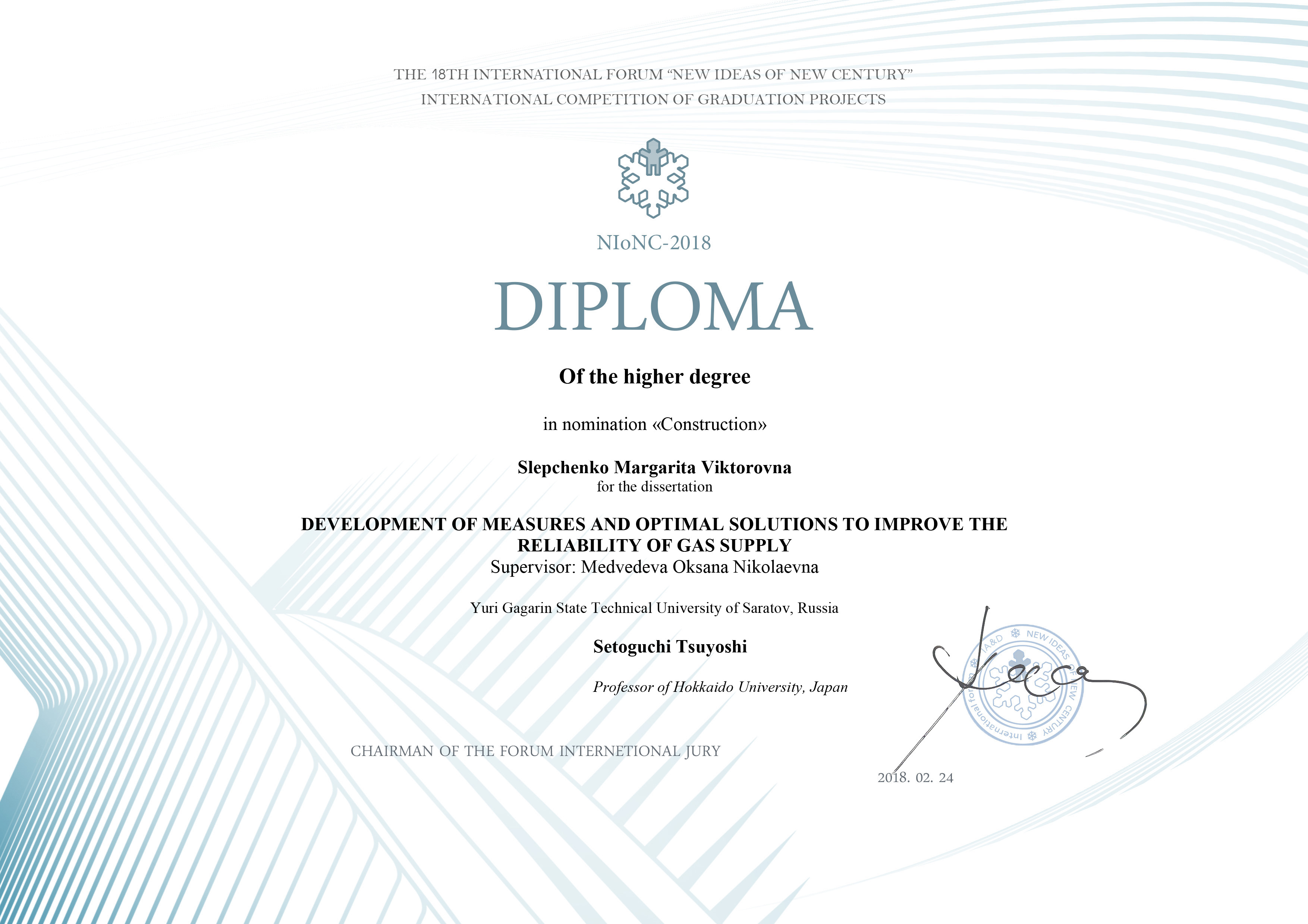 Диплом с отличием в номинации «Строительство» (Higher Degree Diplomas in nomination "Construction") получила выпускная работа магистра Слепченко Маргариты Викторовны «Разработка мероприятий и оптимальных решений по повышению надежности газоснабжения», Руководитель: д.т.н., профессор кафедры ТГВ Медведева Оксана Николаевна.